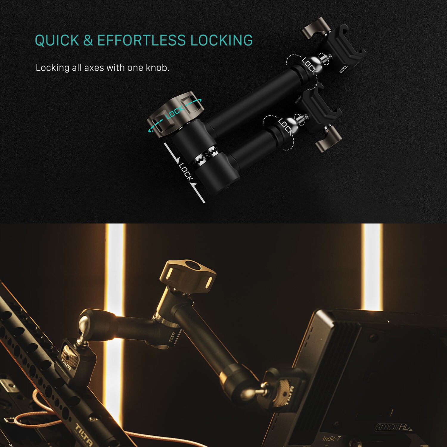 Закрепите аксессуары по вашему выбору на корпусе камеры с помощью шарнирного кронштейна Tilta Pro с двумя шаровыми головками, который оснащен шаровыми головками для свободной регулировки положения. Шарнирный кронштейн оснащен двумя шаровыми головками с винтами 1/4"-20, которые крепятся к корпусу камеры и позволяют устанавливать дополнительные мониторы, беспроводные передатчики или электронные видоискатели. Его длина составляет 10,6 дюйма, а грузоподъемность — 11 фунтов. Кронштейн фиксируется с помощью нескольких винтов с накатной головкой. Шаровые шарниры из нержавеющей стали обеспечивают плавность хода и долговечность конструкции.
