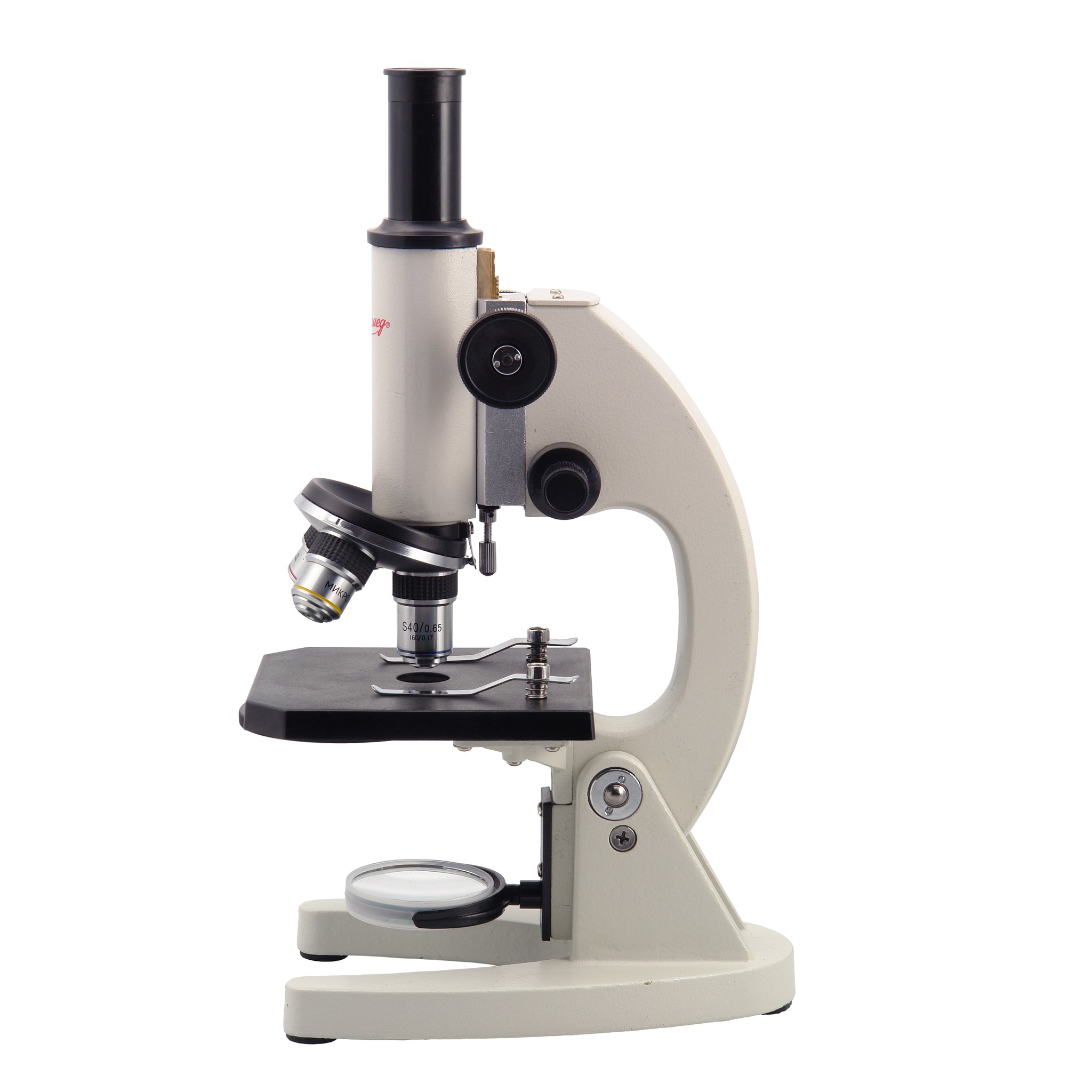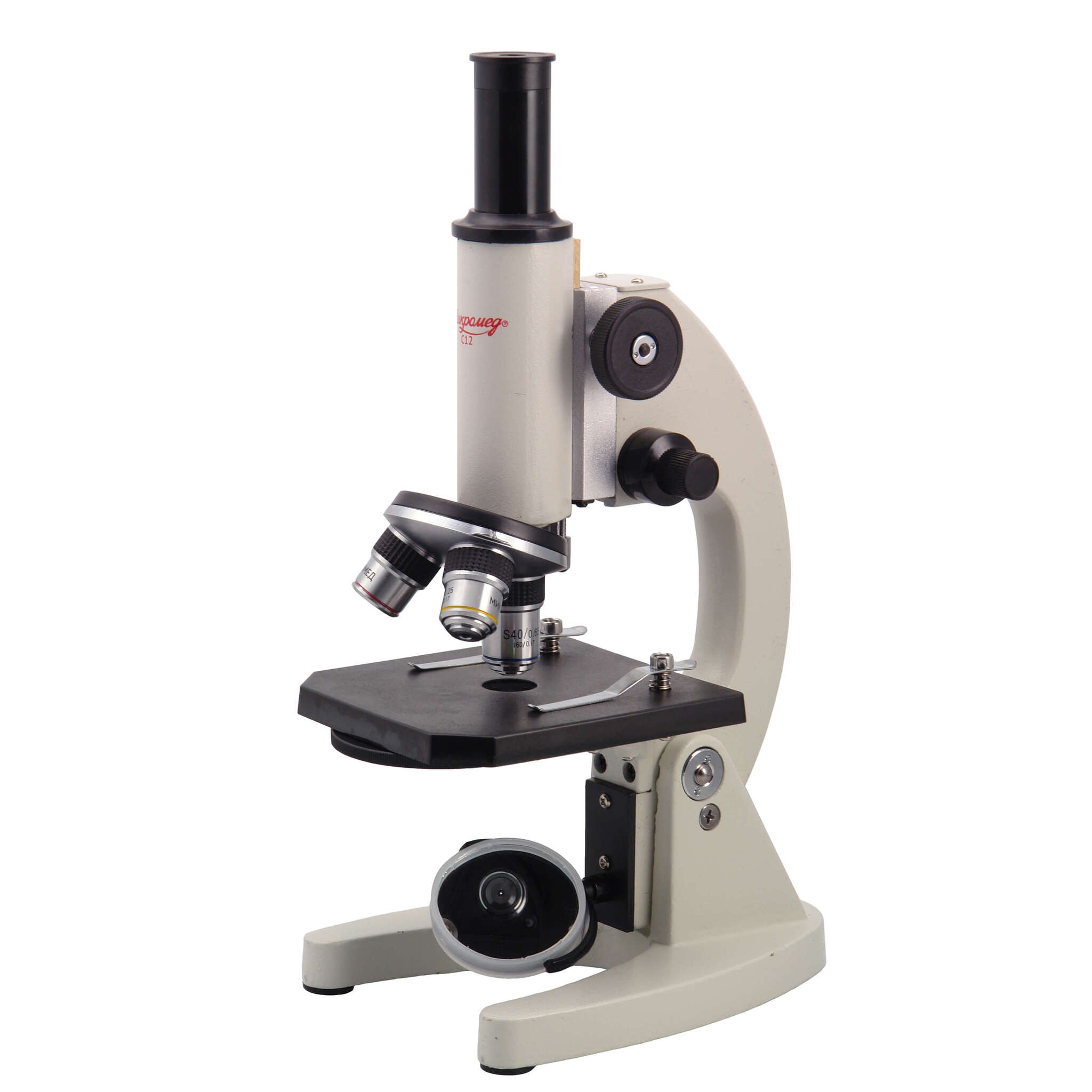 Монокулярный микроскоп. 3х позиционный револьвер объективов. В комплекте 3 ахроматических объектива и два окуляра. Освещение - зеркало с двумя отражающими поверхностями. Грубая и точная фокусировка.