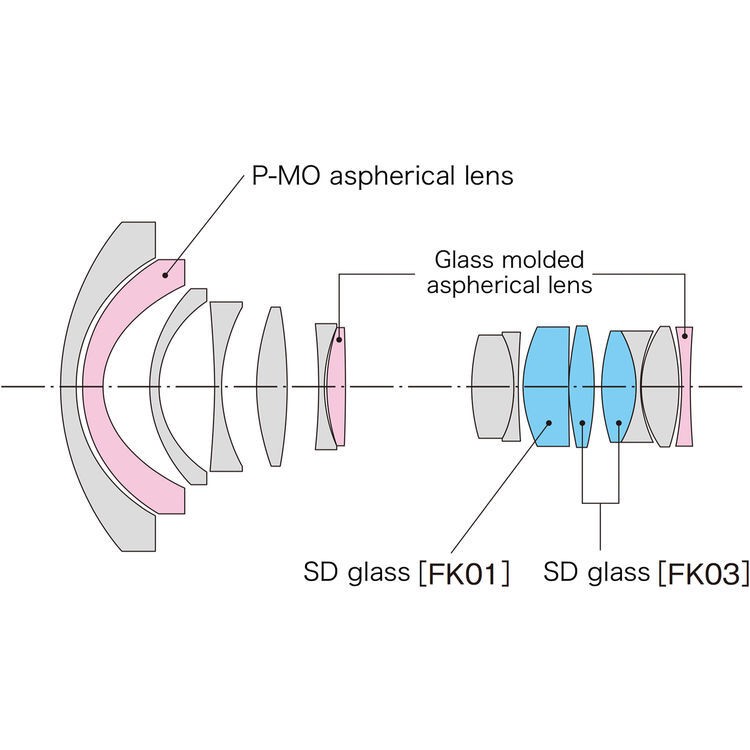 В конструкции объектива 9 лепестковая диафрагма,15 элементов в 13 группах (три асферических элемента и три элемента с низкой дисперсией).