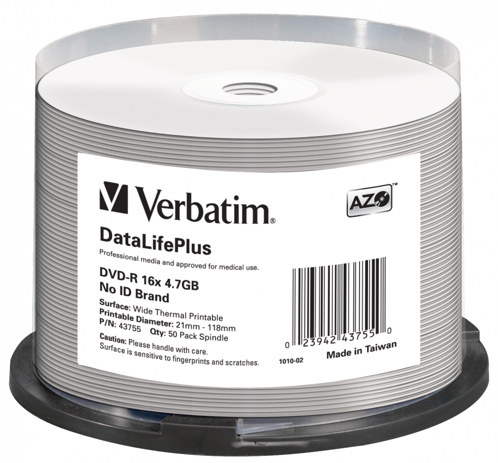 Оптический диск Verbatim DVD-R 4.7GB 16X DataLifePlus AZO Wide Thermal Printable (50 шт.)