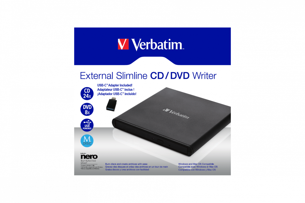 Все больше и больше производителей ноутбуков принимают решение исключить оптический привод из своих устройств для облегчения конструкции. Тем не менее компакт-диски и DVD-диски по-прежнему являются одними из самых широко распространенных типов носителей. Компания Verbatim нашла решение этой проблемы благодаря компактному внешнему пишущему приводу дисков CD/DVD.