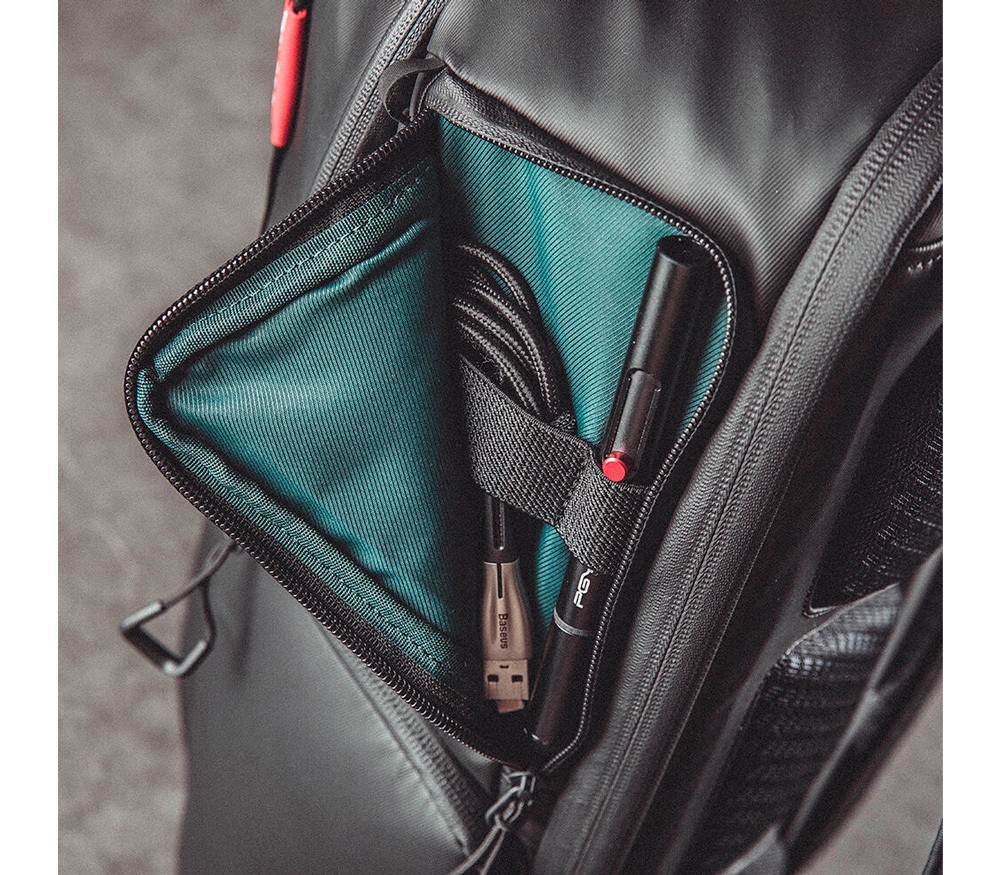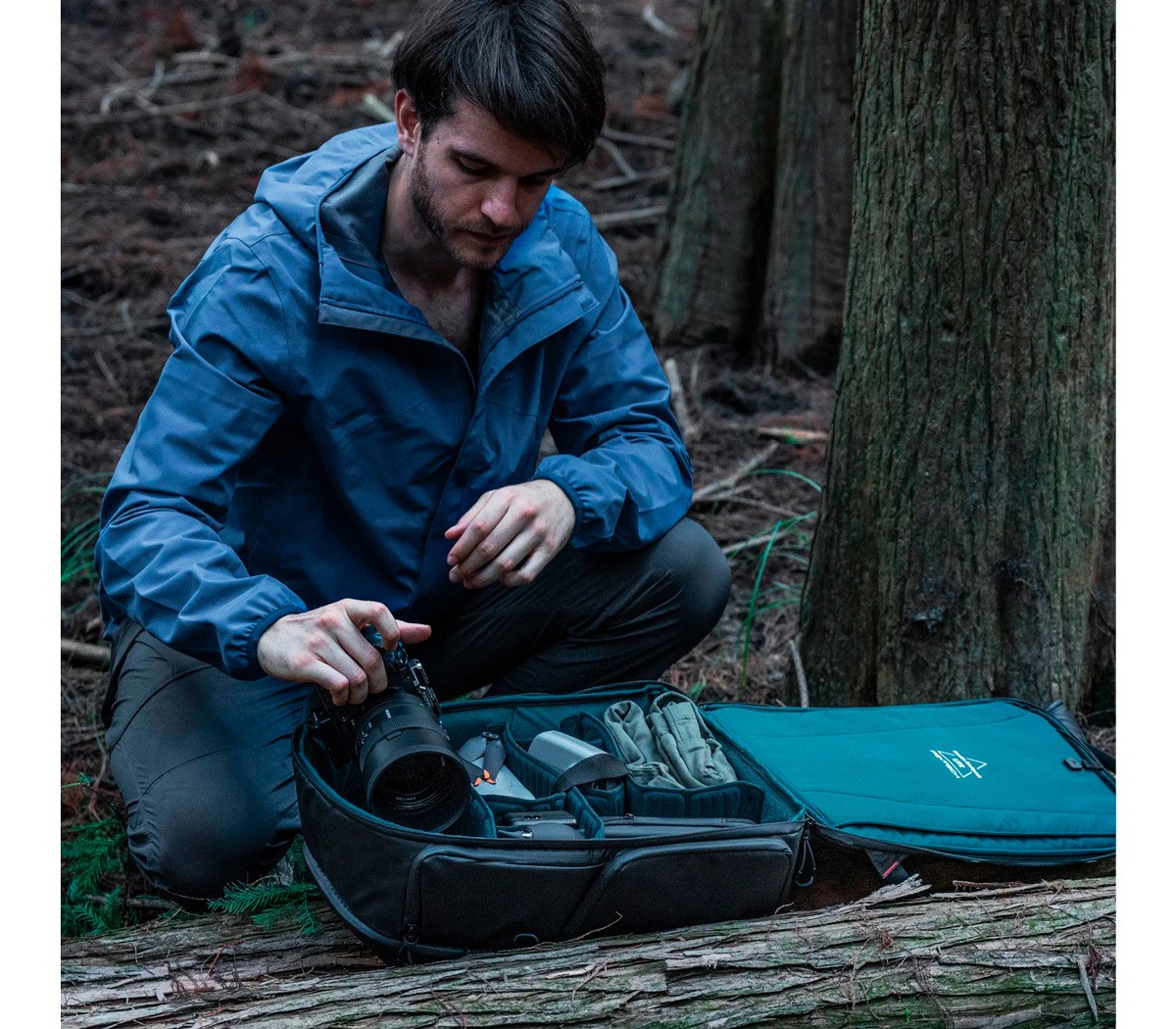 Ноутбук 15.6" (вплоть до MacBook Pro 16") и планшет до 12.9" помещаются в свои индивидуальные внутренние карманы у спинки. Люк основного отделения раскрывается на 180° для удобства упаковки вещей. Быстрый доступ к камере возможен через боковой клапан. С внутренней стороны у него предусмотрен специальный карман для хранения аккумуляторов со встроенными индикаторами: потяните ползунок, чтобы обозначить разряженный аккумулятор (на индикаторе красная полоска сменит зеленую).