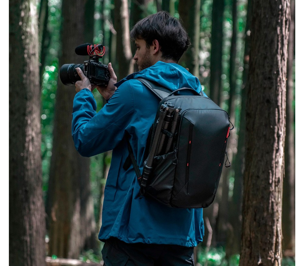 В комплект входят 2 ремня для крепления таких аксессуаров как, например, штатив или туристический коврик (несколько точек крепления позволяют закрепить их сбоку, сверху или снизу). Эргономичная спинка и лямки, а также регулируемая по высоте нагрудная стяжка обеспечивают комфорт при ношении в течение всего дня. На лямках предусмотрены небольшие карманы для таких мелочей как сменные аккумуляторы или крышки объектива. На лямки также можно закрепить пряжку для ношения камеры: такие как Peak Design Capture или PGYTECH Beetle. Также предусмотрено несколько ручек: верхняя, боковая и вдоль всей спинки: с их помощью можно переносить рюкзак вертикально или горизонтально, укладывать в багаж, на верхние полки, а также крепить на ручке дорожного чемодана.