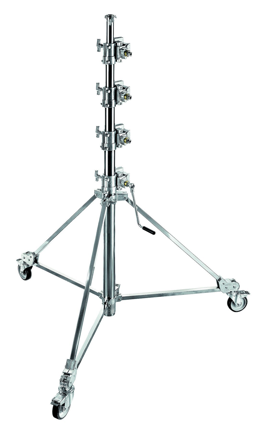 Хромированная стальная стойка оснащена колесами с тормозами и имеет 5 секций с 4 фиксаторами. Прочная стойка можем удерживать вес до 70 кг, максимальная высота составляет 6,10 м. Центральная колонна механизирована, оснащена подъемной рукояткой с храповым механизмом для более безопасной работы.