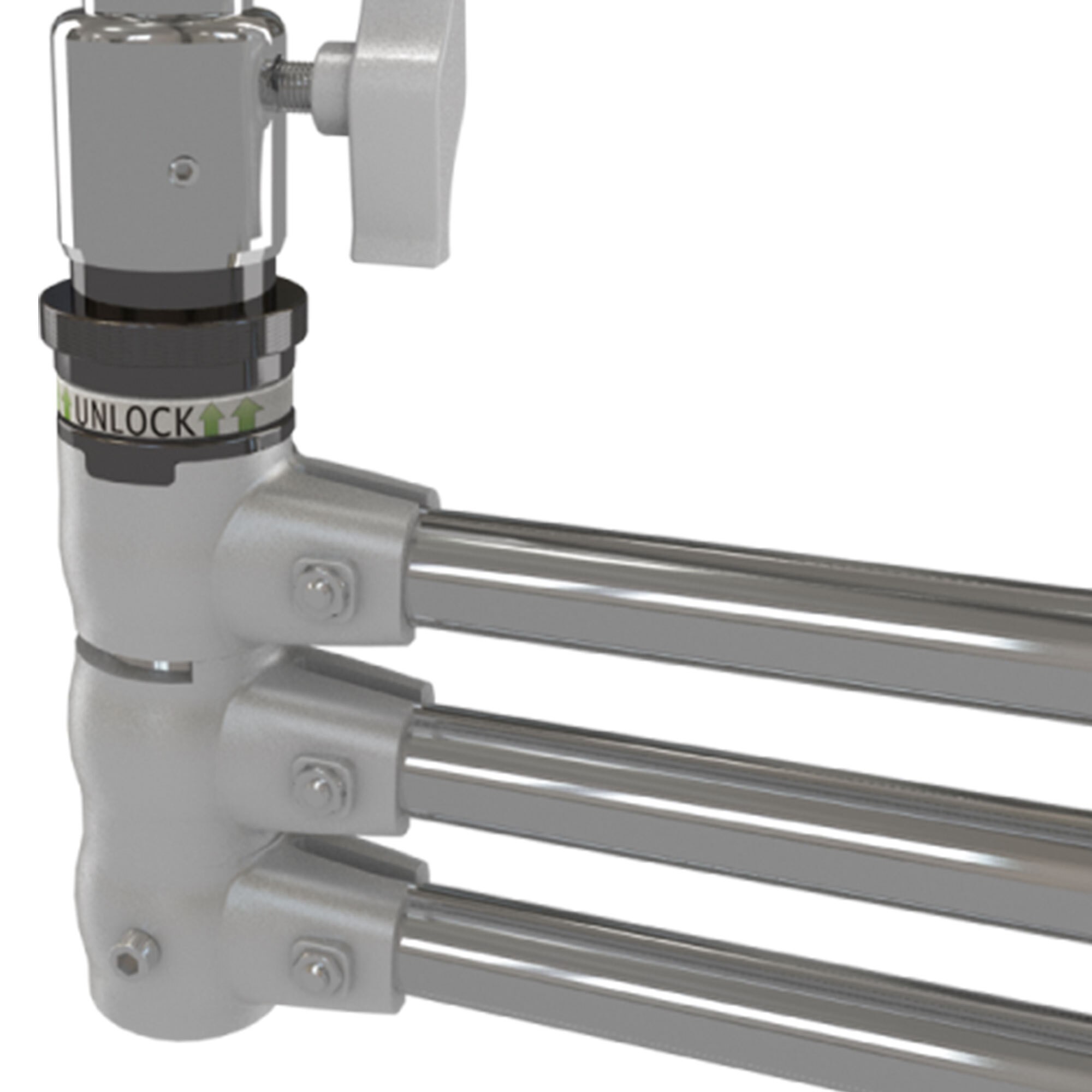 Штанга представляет собой 100 см отрезок стальной трубы диаметром 5/8 дюйма (16 мм) с шестигранным штифтом на одном ее конце и 2- 1/2" поворотной муфтой на другом. Поверхность штанги имеет нескользящую шероховатую фактуру для того чтобы она надежно удерживалась в муфте. Головка 2,5" состоит из пары вращающихся алюминиевых дисков, прикрепленных к гнезду 5/8" (16 мм). Диски оснащены четырьмя V-образными тисками разного размера для крепления любых аксессуаров с 5/8", 1/2", 3/8" или 1/4" крепежными штифтами или трубками. V-образные зажимы имеют зубцы, которые надежно захватывают все, что установлено между пластинами. Головка оснащена эргономичной Т-образной рукояткой увеличенного размера и подшипниками, обеспечивающими максимальный крутящий момент.