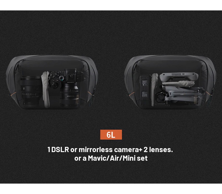 OneGo Solo V2 – серия плечевых сумок. Выпускается в 2-х цветах (черный, зеленый) и 3-х размерах (объем 4, 6 и 10 литров). Версия объемом 6 л хорошо подходит для беззеркальной камеры (включая полнокадровые модели) с 2-3 объективами среднего размера или для складного квадрокоптера типа DJI Mavic с пультом управления и аксессуарами. Основное отделение организуется с помощью 2 разделителей на липучках. У модели 6L по сравнению с 4-литровой версией добавлен передний карман на молнии, а также имеется складной карман для бутылки воды (убирается внутрь сумки, когда не используется). Ремень снабжен широкой и мягкой плечевой накладкой._