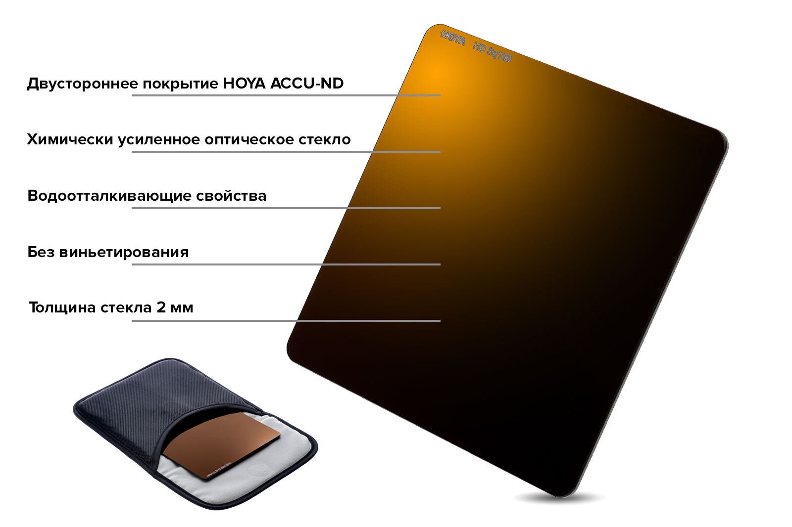 HOYA HD Sq100 IRND8 - это квадратный фильтр шириной 100 мм, который снижает экспозицию на 3 ступени, что позволяет снимать с более длинными выдержками. Выдержку увеличивают, когда, например, нужно создать эффект движения на фотографии, в портретной съёмке, чтобы получить малую глубину резкости, или в видео, где управление выдержкой особенно важно.