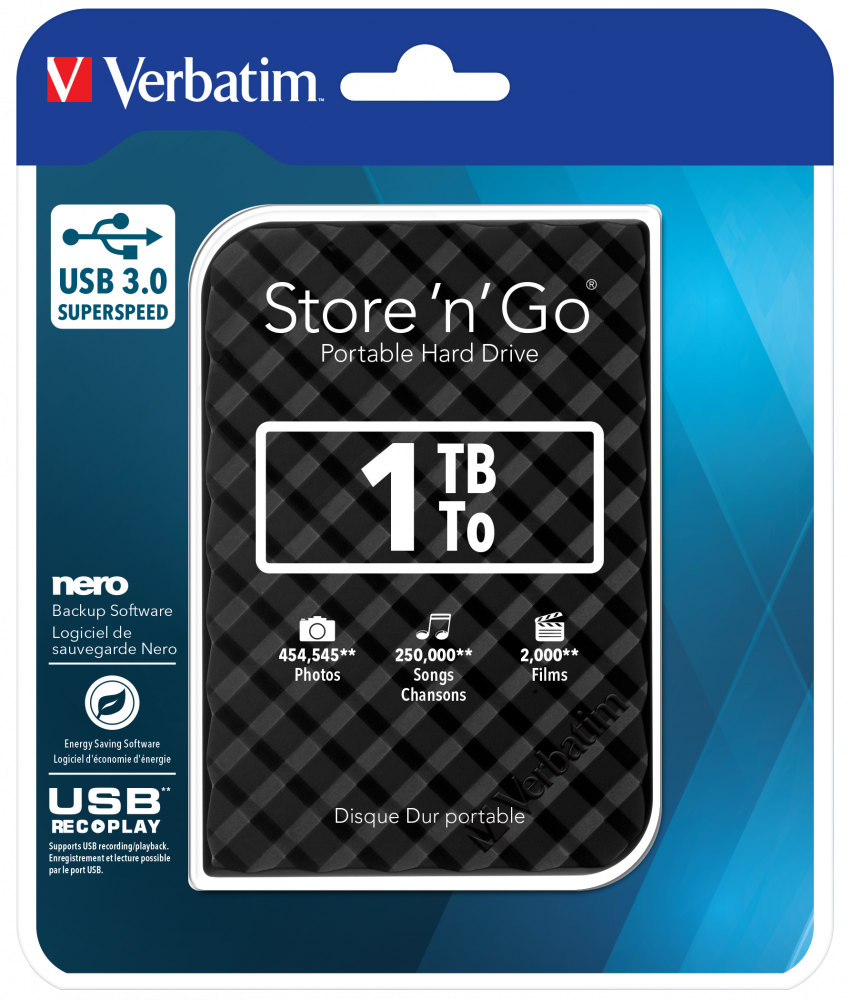 Переносной жесткий диск Verbatim Store 'n' Go — это высокопроизводительное устройство для хранения данных, которое поддерживает сверхбыстрый интерфейс USB 3.0. Этот интерфейс может работать в 10 раз быстрее, чем USB 2.0 (в зависимости от скорости USB-шины), благодаря чему данные передаются практически мгновенно. Храните и переносите файлы с помощью по-настоящему мобильного устройства. Стильный дизайн корпуса прекрасно подойдет к современному рабочему столу и будет отлично сочетаться с ноутбуком. Переносной жесткий диск Store 'n' Go оснащен одним портом USB 3.0, однако совместим с портами USB 2.0, которыми могут быть оборудованы настольные компьютеры и ноутбуки. При этом он не требует внешнего источника питания. Просто подключите жесткий диск к компьютеру, и он сразу будет готов к работе.