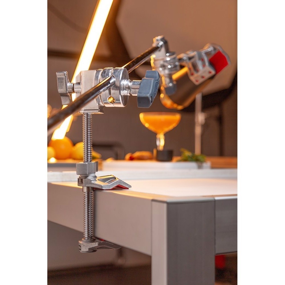 Высоконагрузочный торцевой зажим типа "мателлини" ("мотыль") с возможностью раскрытия на 15 см, креплении к круглым, квадратным или прямоугольным в сечении объектам и максимальной нагрузкой 50 кг. Зажим с одной зафиксированной губкой на конце стержня удобно позиционировать в ограниченном пространстве. Палец 16 мм (5/8’’) на конце стержня делает его совместимым с большинством светового оборудования и другого студийного оснащения.