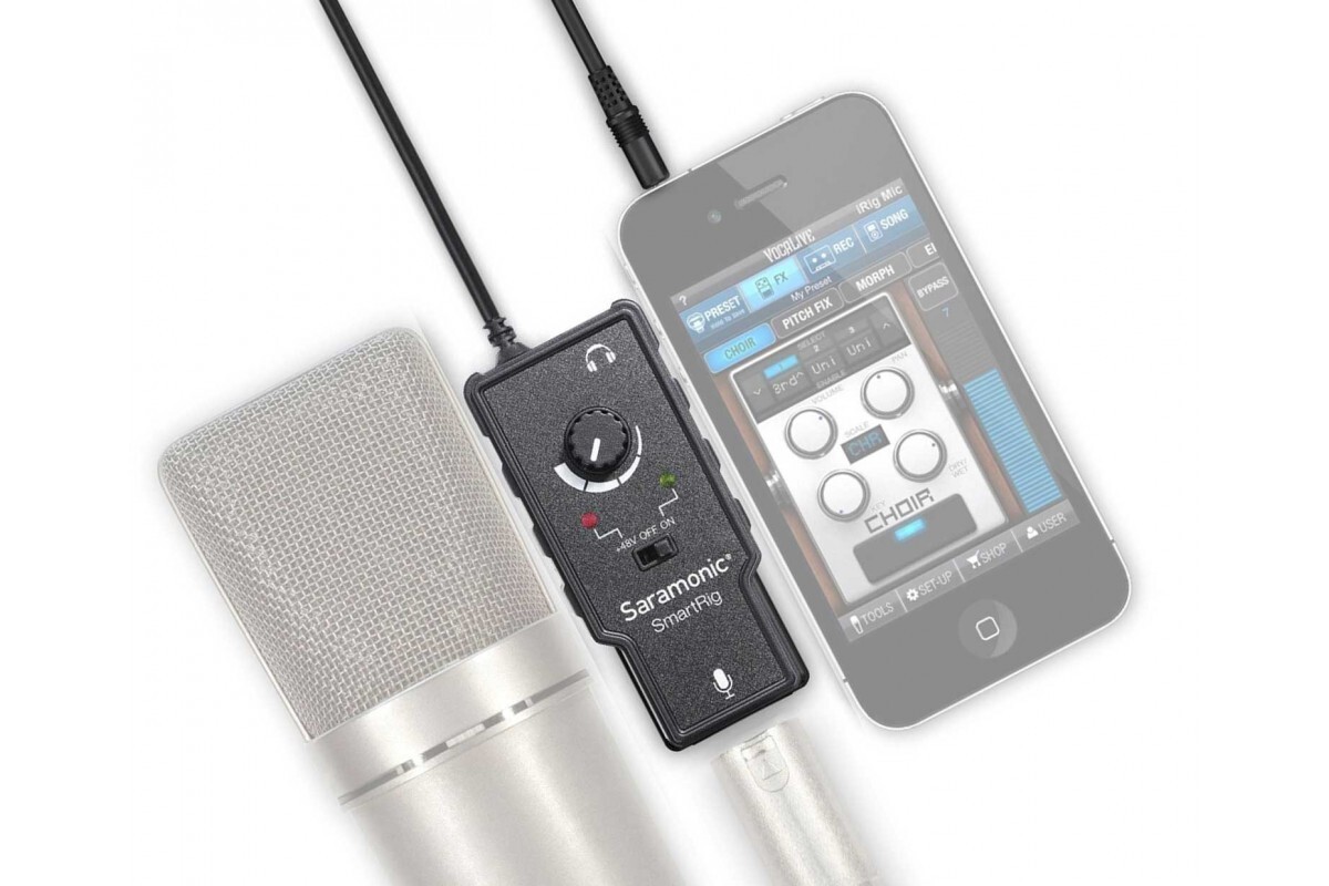 Адаптер SmartRig предназначен для подключения источников микрофонов с разъемом XLR и гитар через джек 6,35 мм к смартфонам и планшетам на базе операционных систем Google Android и Apple iOS через разъем джек 3,5 мм TRRS. Для подключения к разъемам Lightning или USB-C требуется опциональный переходник. Адаптер оснащен предусилителем и может обеспечить фантомное питание 12/48 В с силой тока до 13 мА, что позволяет использовать конденсаторные микрофоны, студийные и сценические микрофоны. Питание от батареи 9V типа крона.