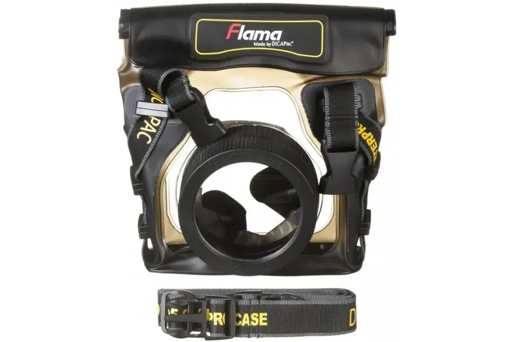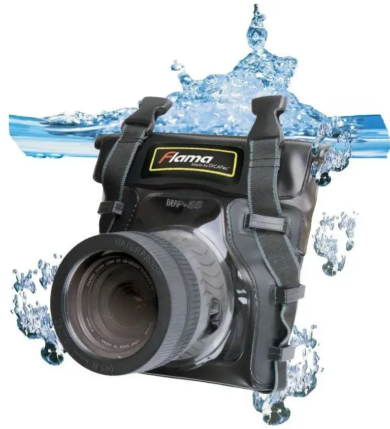 Водонепроницаемый чехол Flama - надежный и доступный водонепроницаемый футляр для небольших и среднеразмерных цифровых фотокамер из прозрачного винила и полиуретана.