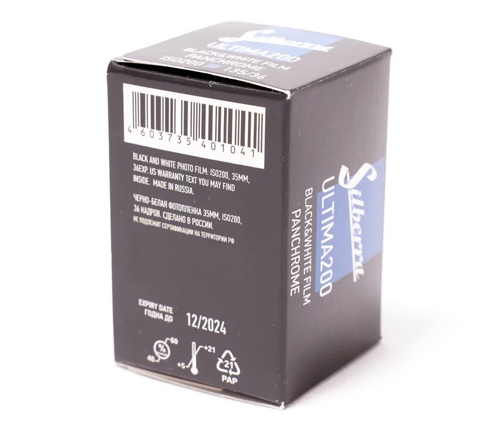 Фотопленка Silberra ULTIMA200 – панхроматическая негативная черно-белая фотопленка высокого контраста с номинальной чувствительностью по ISO = 200, на подложке из прозрачного полиэстера, обеспечивающей исключительную стабильность материала. Толщина подложки – 0,06 мм. Специальный материал подложки с гидрофобным покрытием не только ускоряет сушку негативов после проявки, но и препятствует образованию капельных следов; кроме того, пленка не скручивается при сушке и может размещаться в сушильных шкафах без дополнительных грузов внизу. Особо тонкая подложка пленки позволяет получить отличные результаты при гибридном процессе обработки, когда после проявки негативы предназначены для сканирования и цифровой обработки.