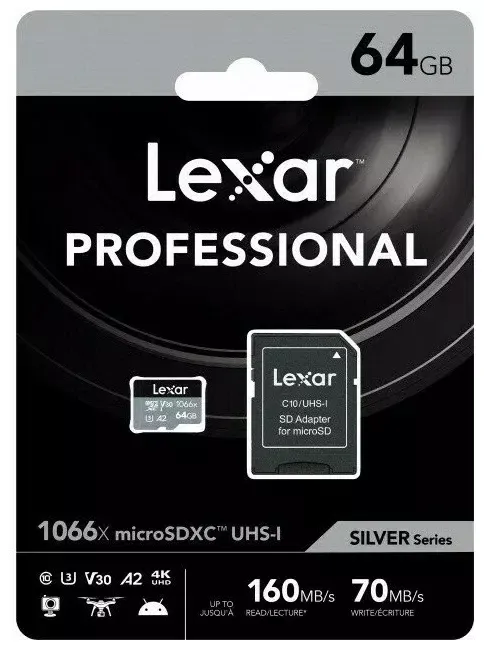 Карта памяти Lexar Professional 1066x Silver microSDXC 64GB с адаптером (входит в комплект).
