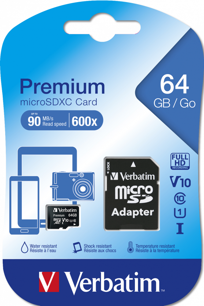 Карта памяти Verbatim Premium microSDXC 64GB UHS-I U1 V10, R 90 МБ/с с адаптером