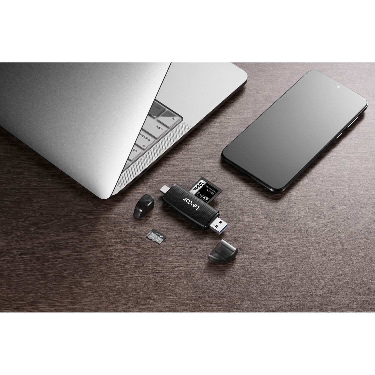 Устройство Lexar Dual-Slot USB-A/C Reader с двумя слотами для карт памяти работает с форматами SD и microSD, позволяя легко переносить проекты одновременно.