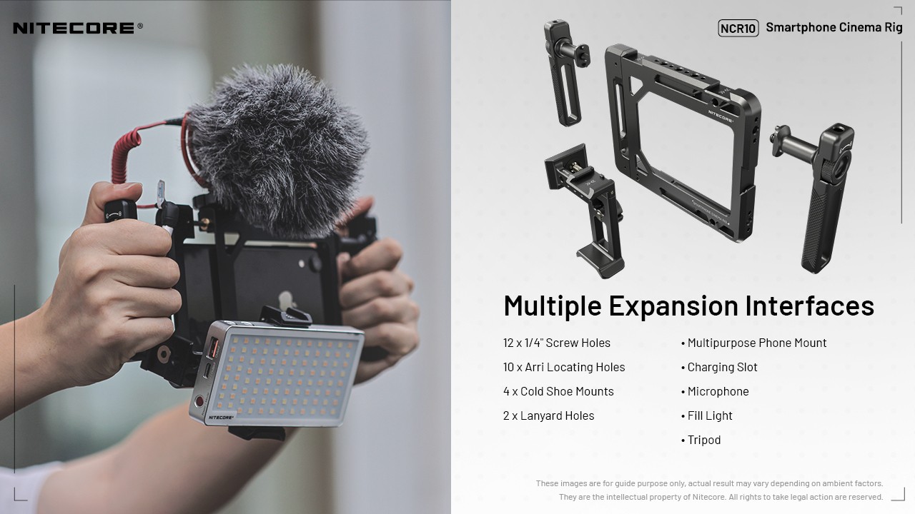 - NITECORE NCR10 Smartphone Cinema Rig изготовлен из алюминиевого сплава с ЧПУ и имеет несколько интерфейсов расширения, таких как: 12 отверстий под винты 1/4 дюйма и 4 крепления типа "холодный башмак". Клетка оснащена регулируемыми двойными ручками и может использоваться с телефонами.