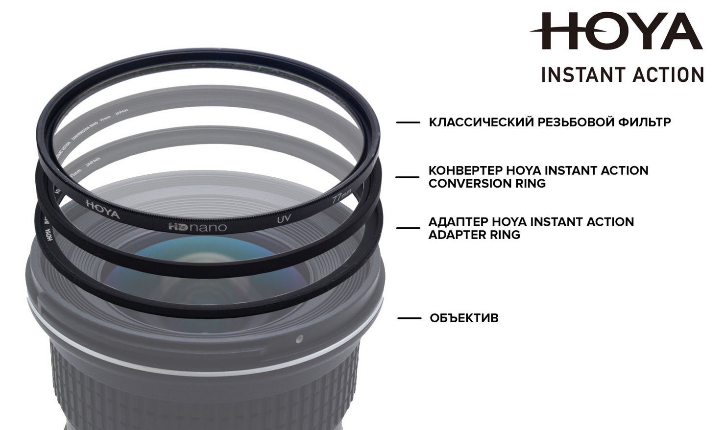 Кольцо-адаптер объектива HOYA INSTANT ACTION ADAPTER RING совместно с держателем фильтра HOYA INSTANT ACTION CONVERSION RING позволяют мгновенно крепить и снимать обычные резьбовые фильтры на объектив с помощью силы магнита.