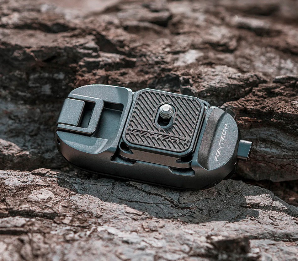 PGYTECH Beetle Camera Clip – металлическая пряжка для крепления камеры на поясном ремне, нагрудной лямке рюкзака или любом другом ремне шириной до 7.5 см и толщиной до 1.5 см. Съемная площадка крепится в штативное гнездо камеры, стандартная площадка позволяет ставить камеру в любом из 4 направлений. Например, поставив камеру боком, удобно менять объективы. Боковое крепление также хорошо подходит для камер с короткими объективами. Пряжку можно установить и на более широкие ремни, немного сжав их по краям.