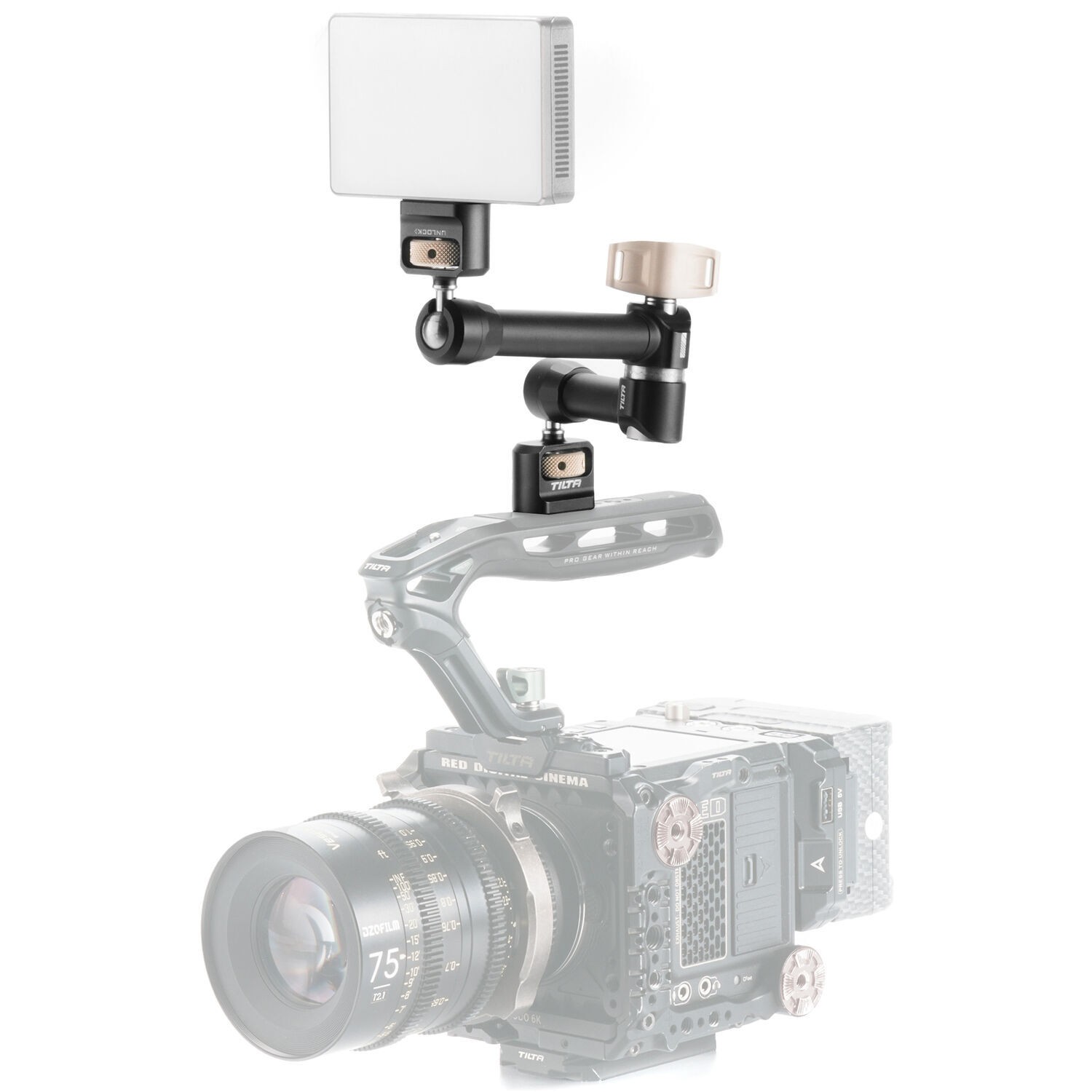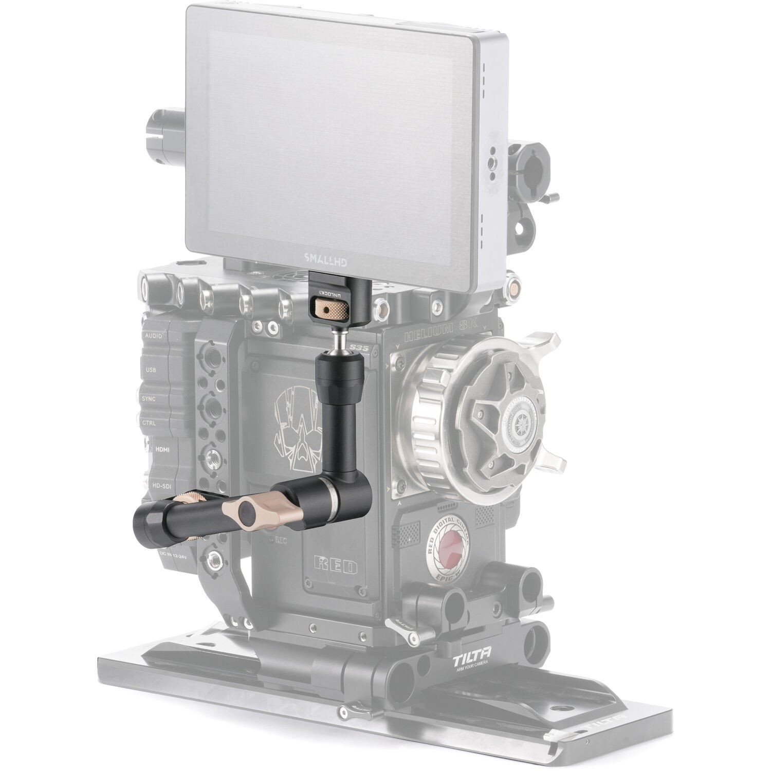 Закрепите аксессуары по вашему выбору на корпусе камеры с помощью шарнирного кронштейна Tilta Pro с двумя шаровыми головками, который оснащен шаровыми головками для свободной регулировки положения. Шарнирный кронштейн оснащен двумя шаровыми головками с винтами 1/4"-20, которые крепятся к корпусу камеры и позволяют устанавливать дополнительные мониторы, беспроводные передатчики или электронные видоискатели. Его длина составляет 10,6 дюйма, а грузоподъемность — 11 фунтов. Кронштейн фиксируется с помощью нескольких винтов с накатной головкой. Шаровые шарниры из нержавеющей стали обеспечивают плавность хода и долговечность конструкции.