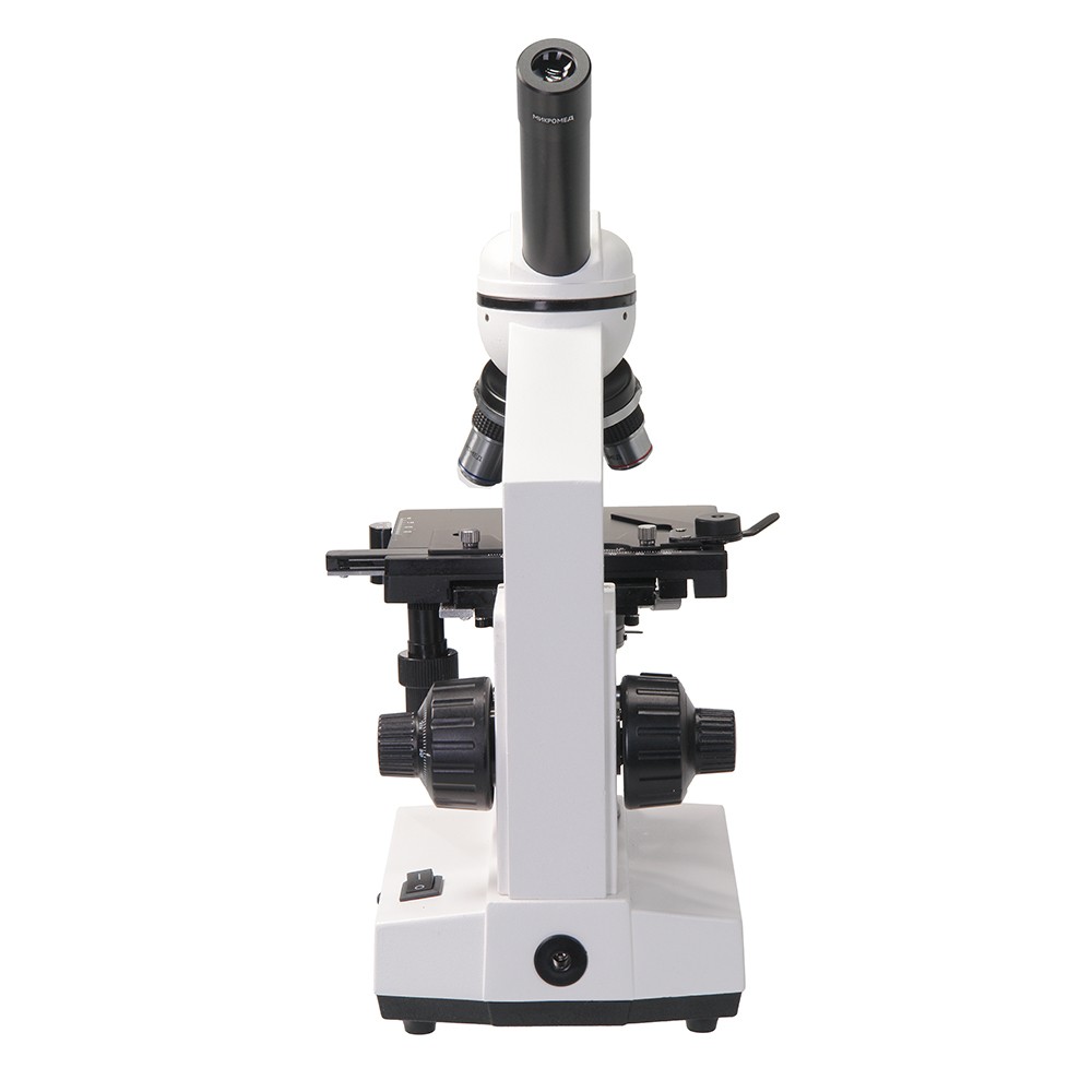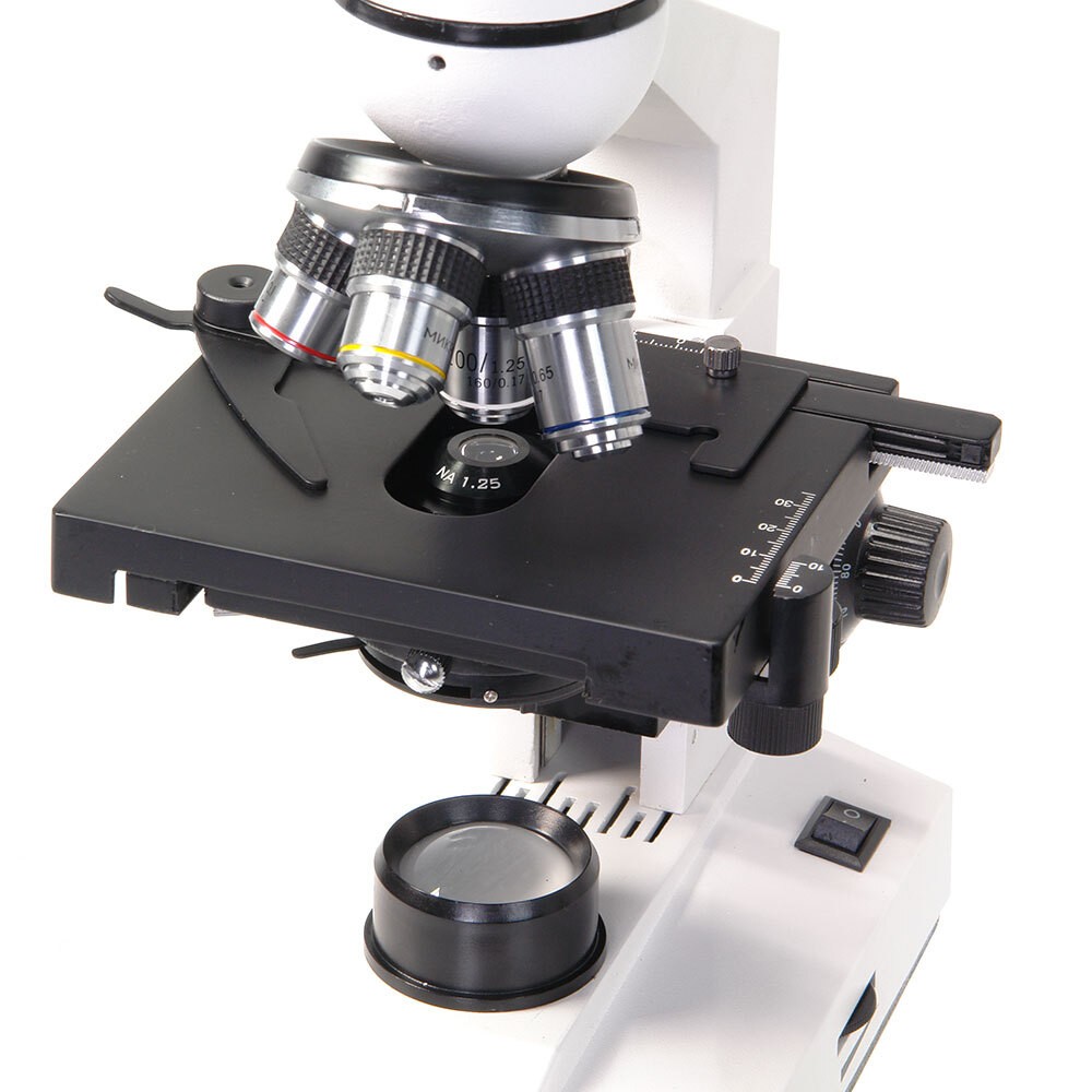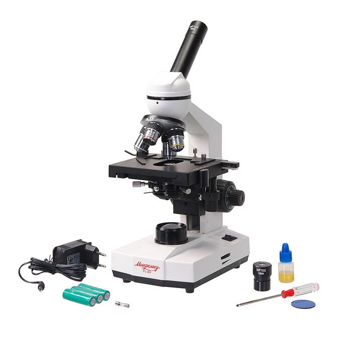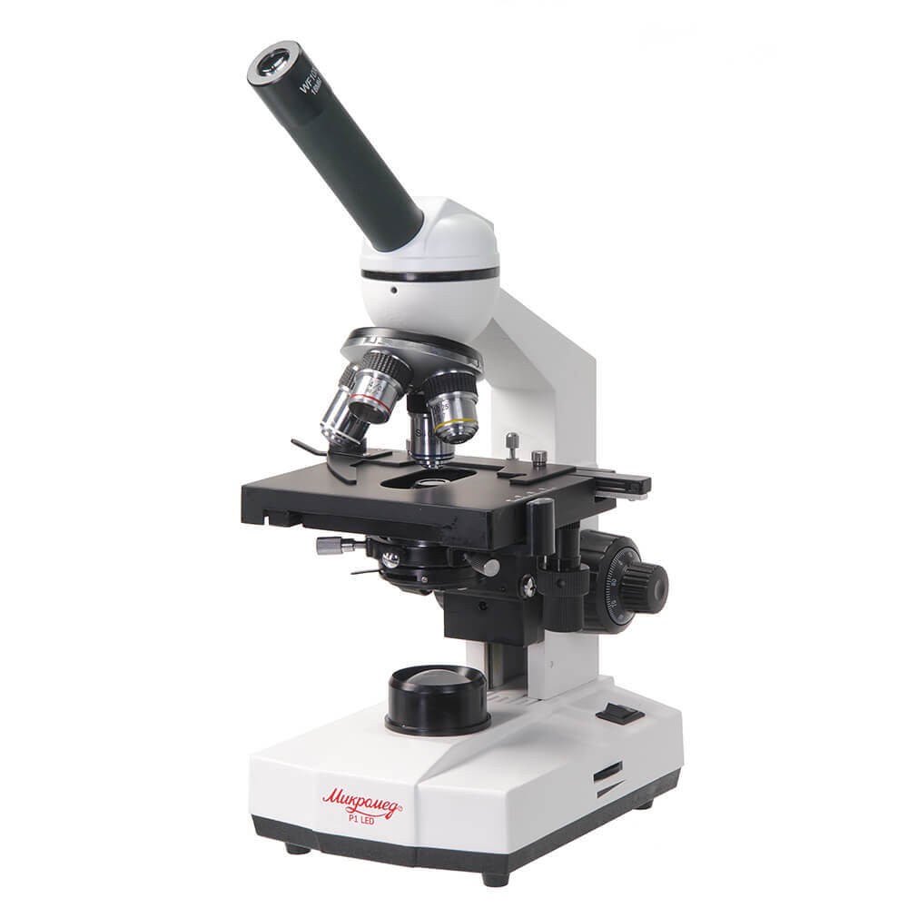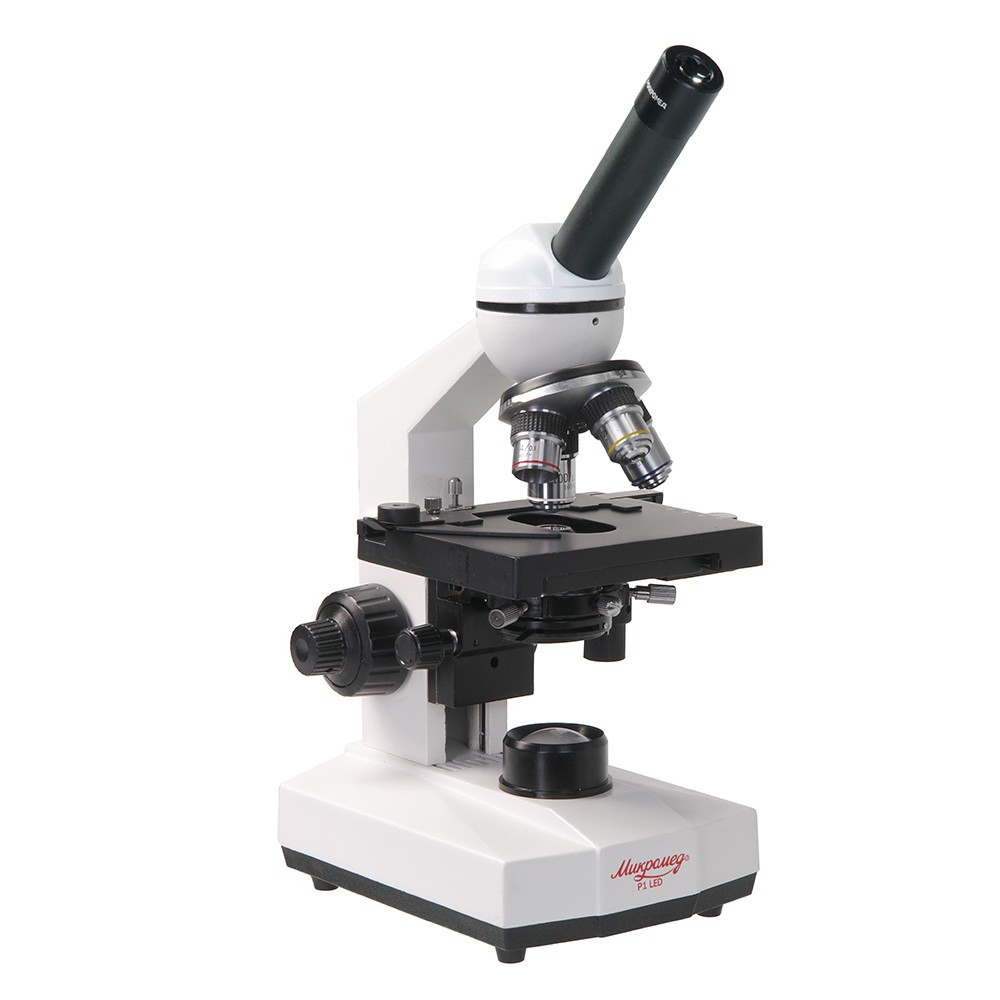 Монокулярный микроскоп Микромед Р-1 LED. 4 объектива и 2 окуляра. Увеличение до 1600х. Светодиодный осветитель. Ахроматическая оптика. Конденсор Аббе. Четырех позиционный револьвер объективов.