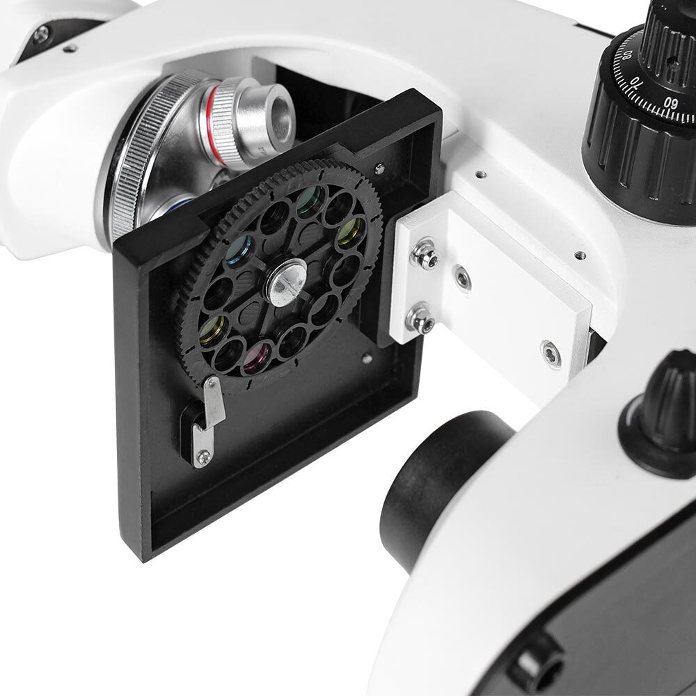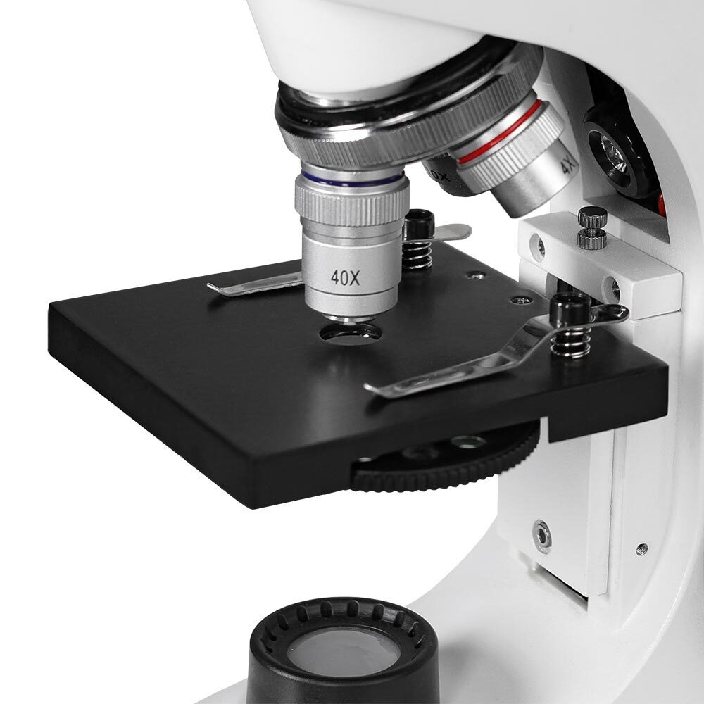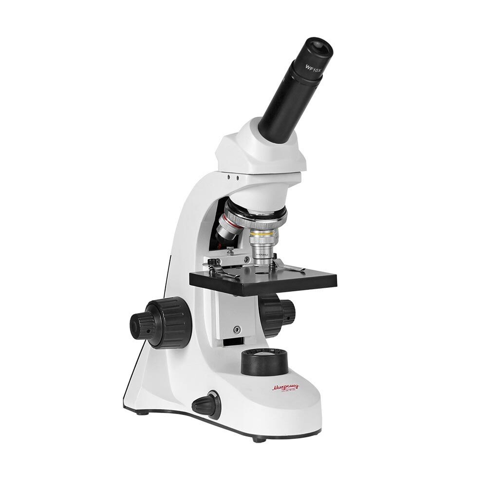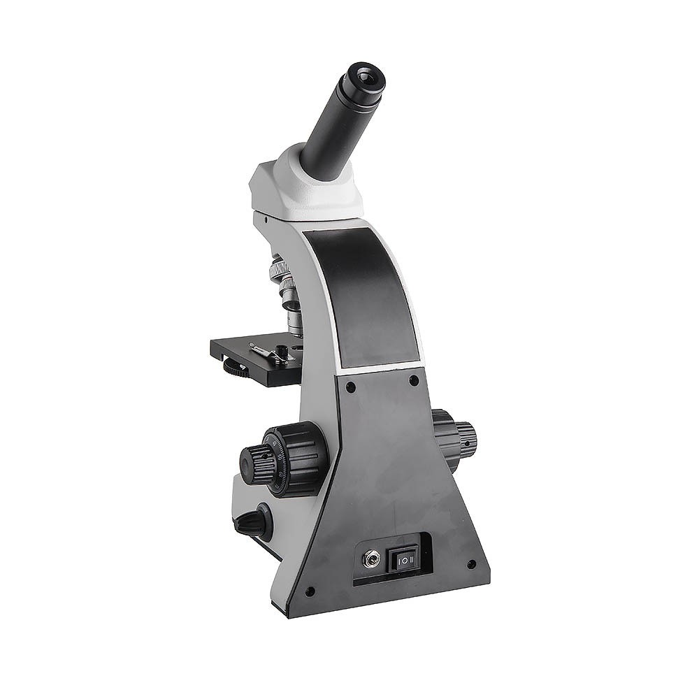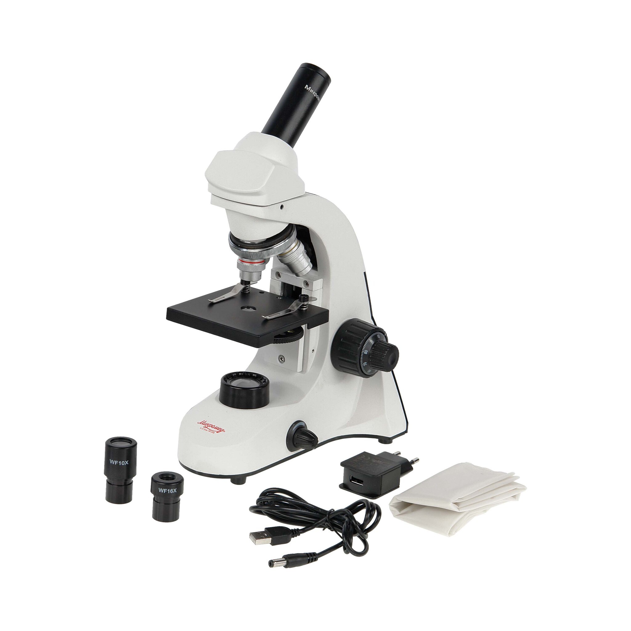 Монокулярный микроскоп с 3 ахроматическими объективами в комплекте, окуляры 10х и 16х, светодиодные осветители отраженного и проходящего света, тонкая фокусировка, питание от трёх батареек АА (входят в комплект) или от сети переменного тока 220В.