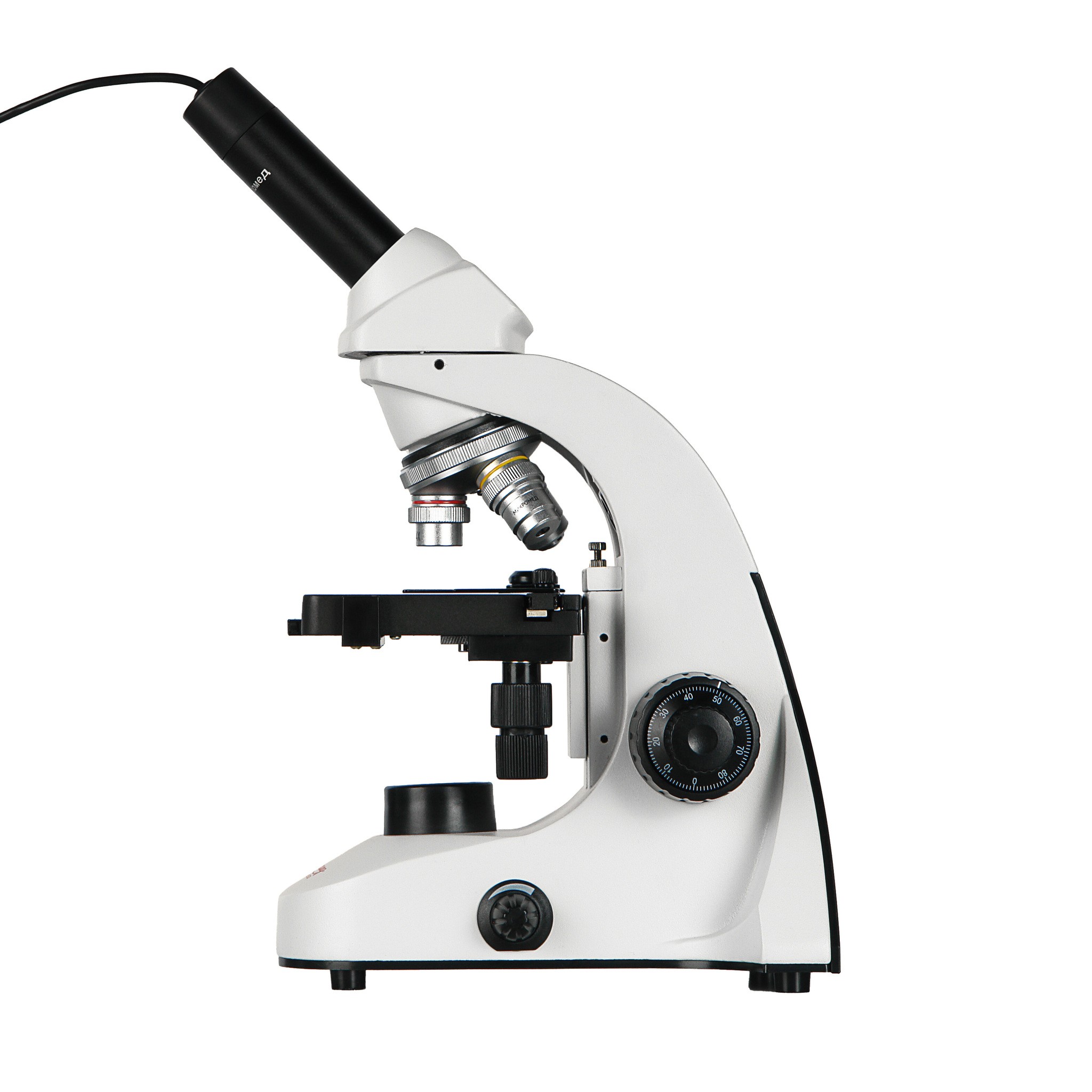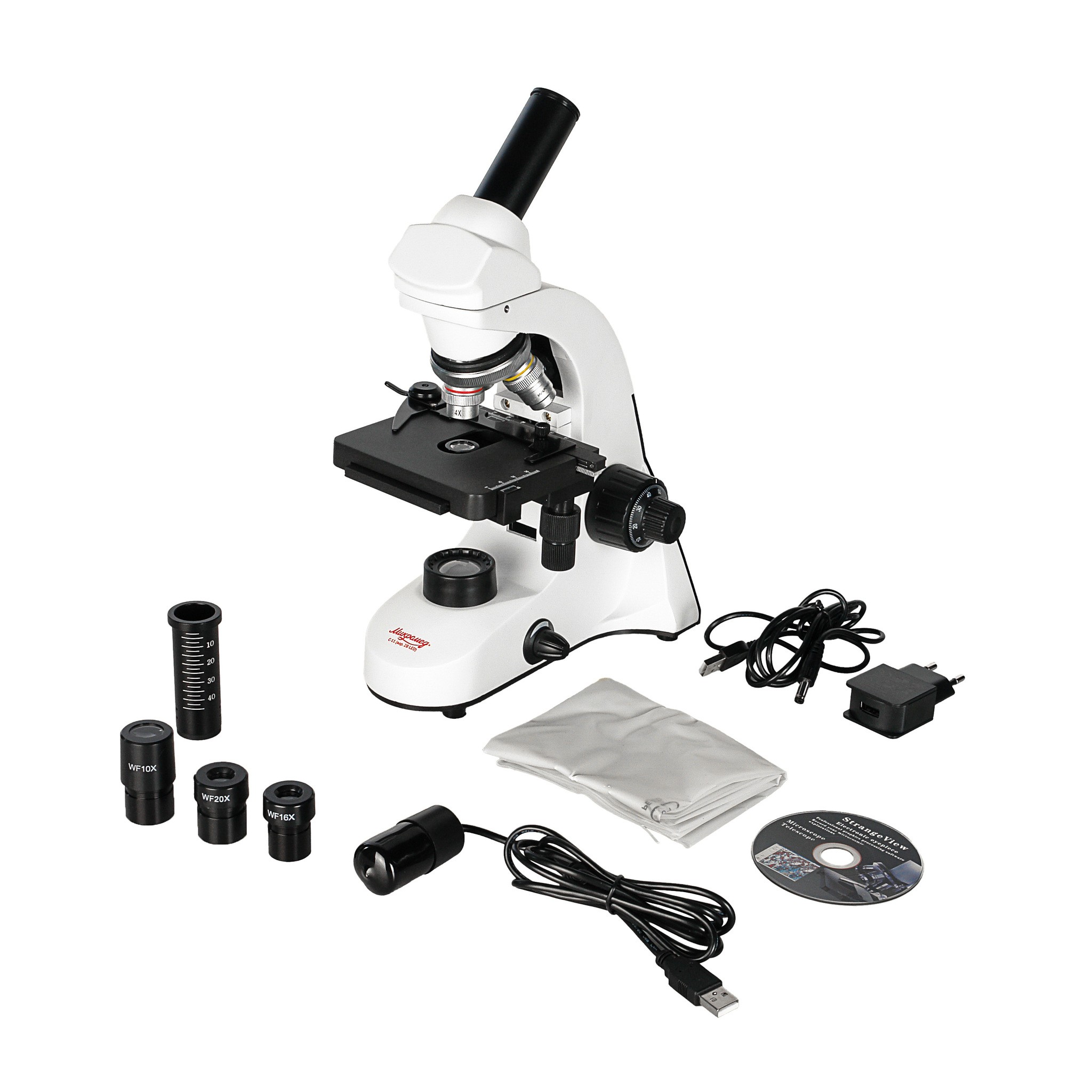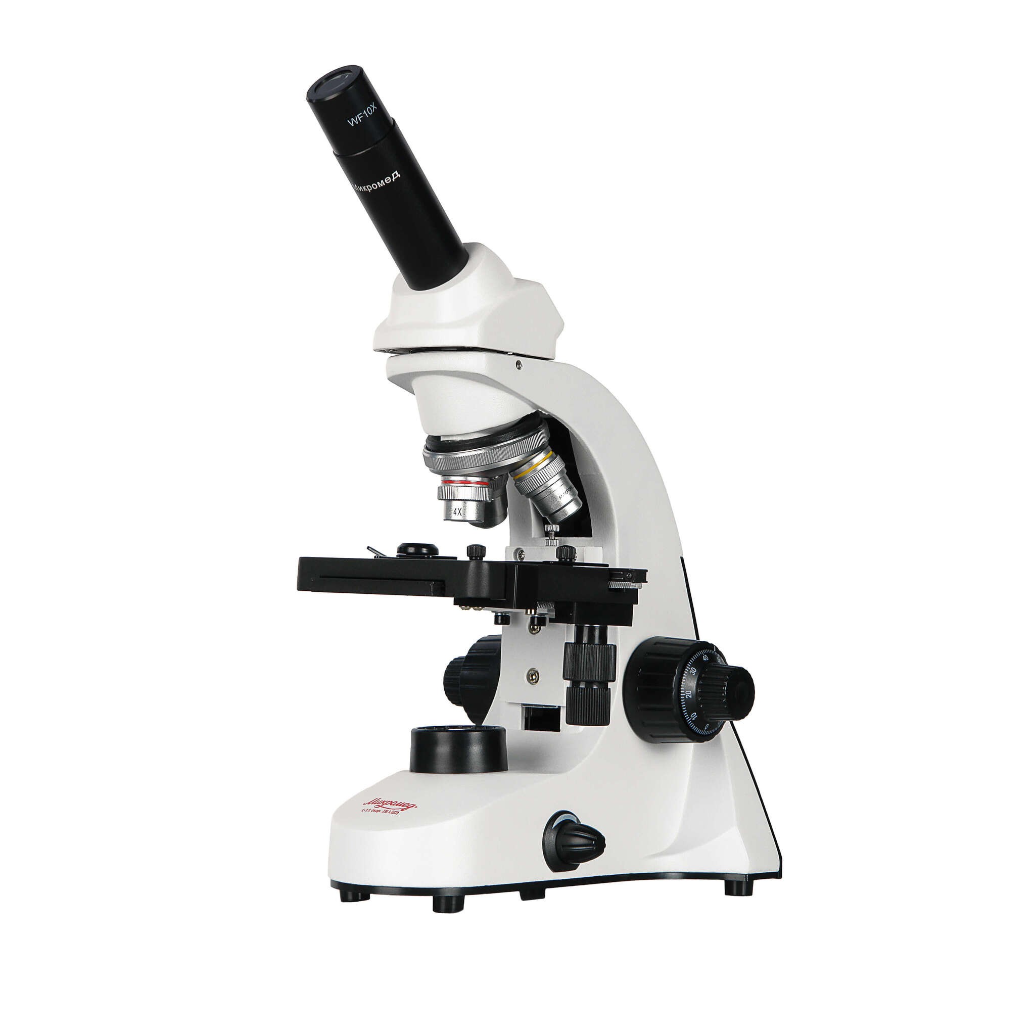 Монокулярный биологический микроскоп для исследований в проходящем свете и отраженном свете. Увеличение от 80х до 800х (до 1280х с линзой Барлоу). Объективы с ахроматической коррекцией. Револьверное устройство на 3 объектива. Светодиодный осветитель. Металлический штатив.