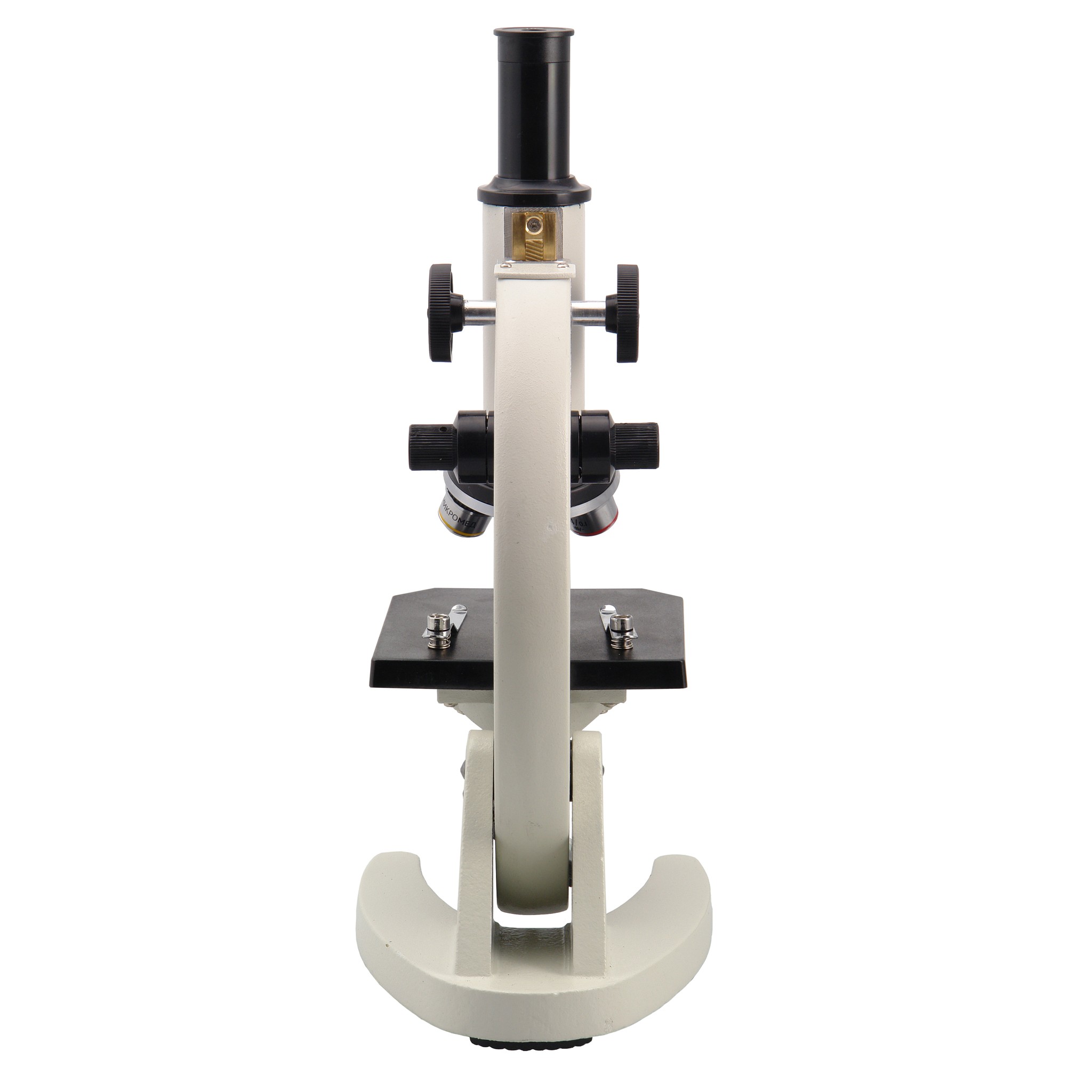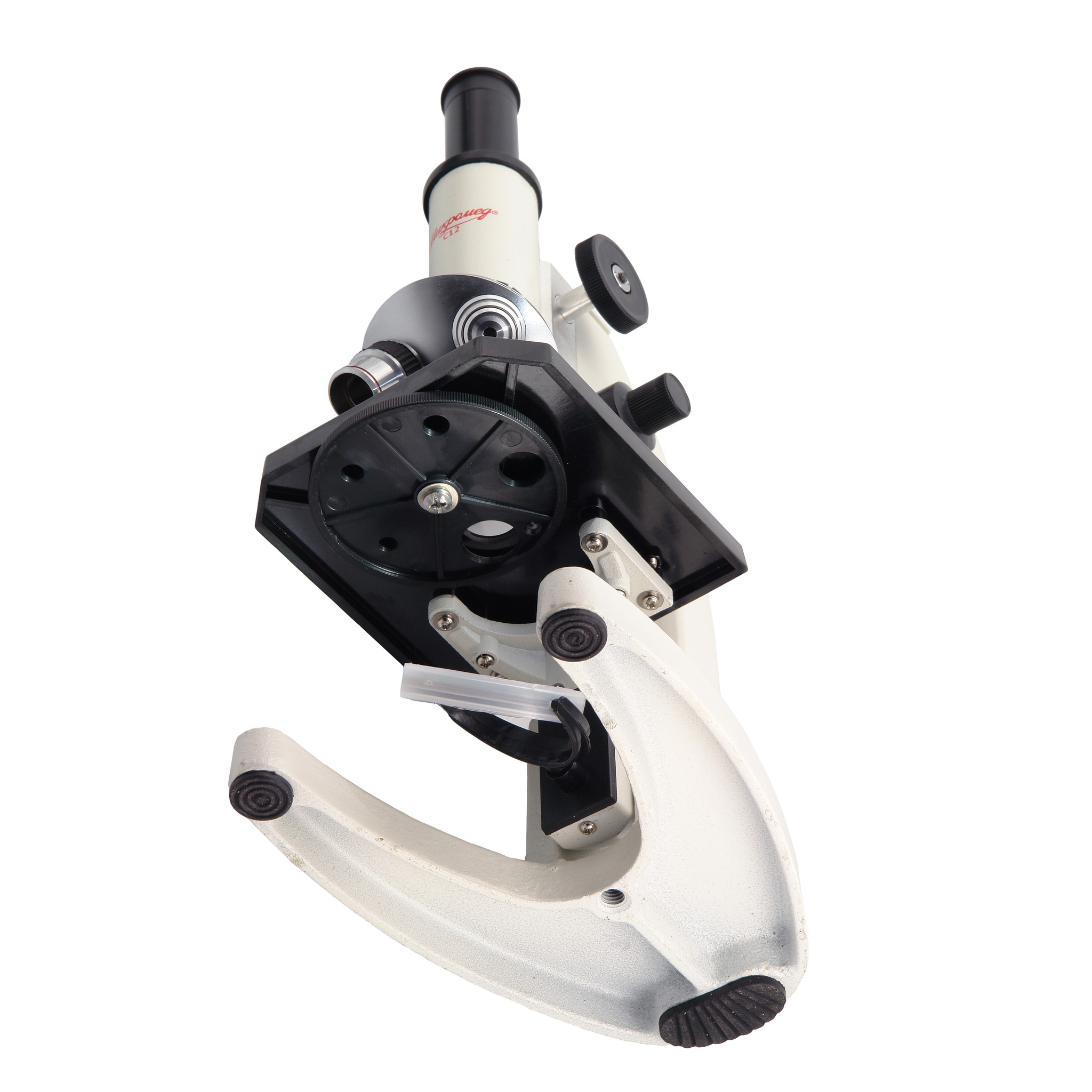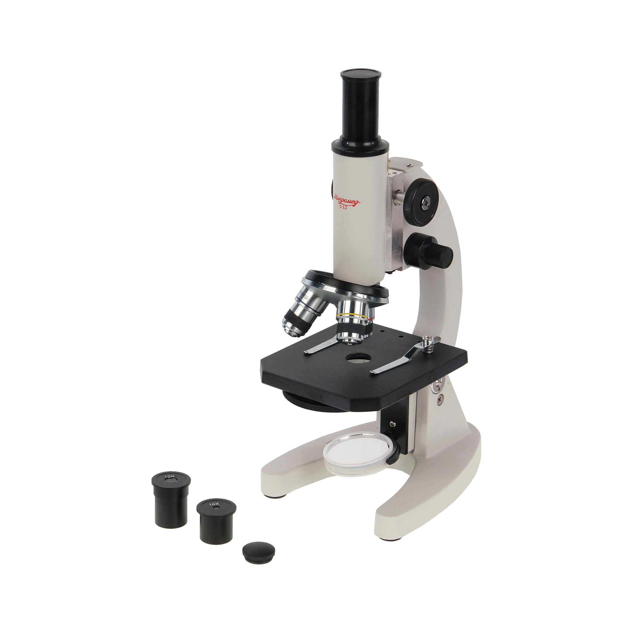Монокулярный микроскоп. 3х позиционный револьвер объективов. В комплекте 3 ахроматических объектива и два окуляра. Освещение - зеркало с двумя отражающими поверхностями. Грубая и точная фокусировка.
