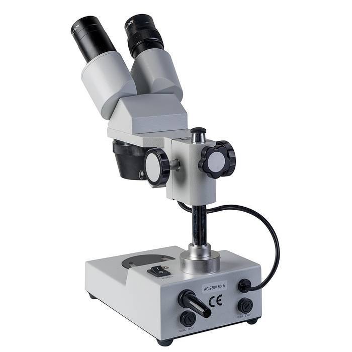 Имеет два увеличения 20х и 40х. Рабочее расстояние 57 мм, источник света – встроенный осветитель отраженного света.