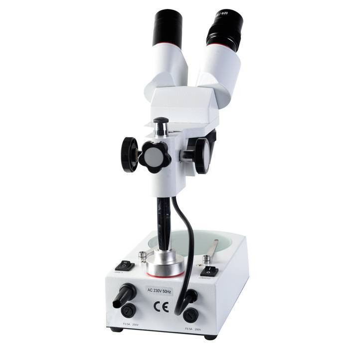 Имеет три увеличения – 10х, 20х и 40х. Рабочее расстояние 57 мм. Встроенные осветители отраженного и проходящего света.