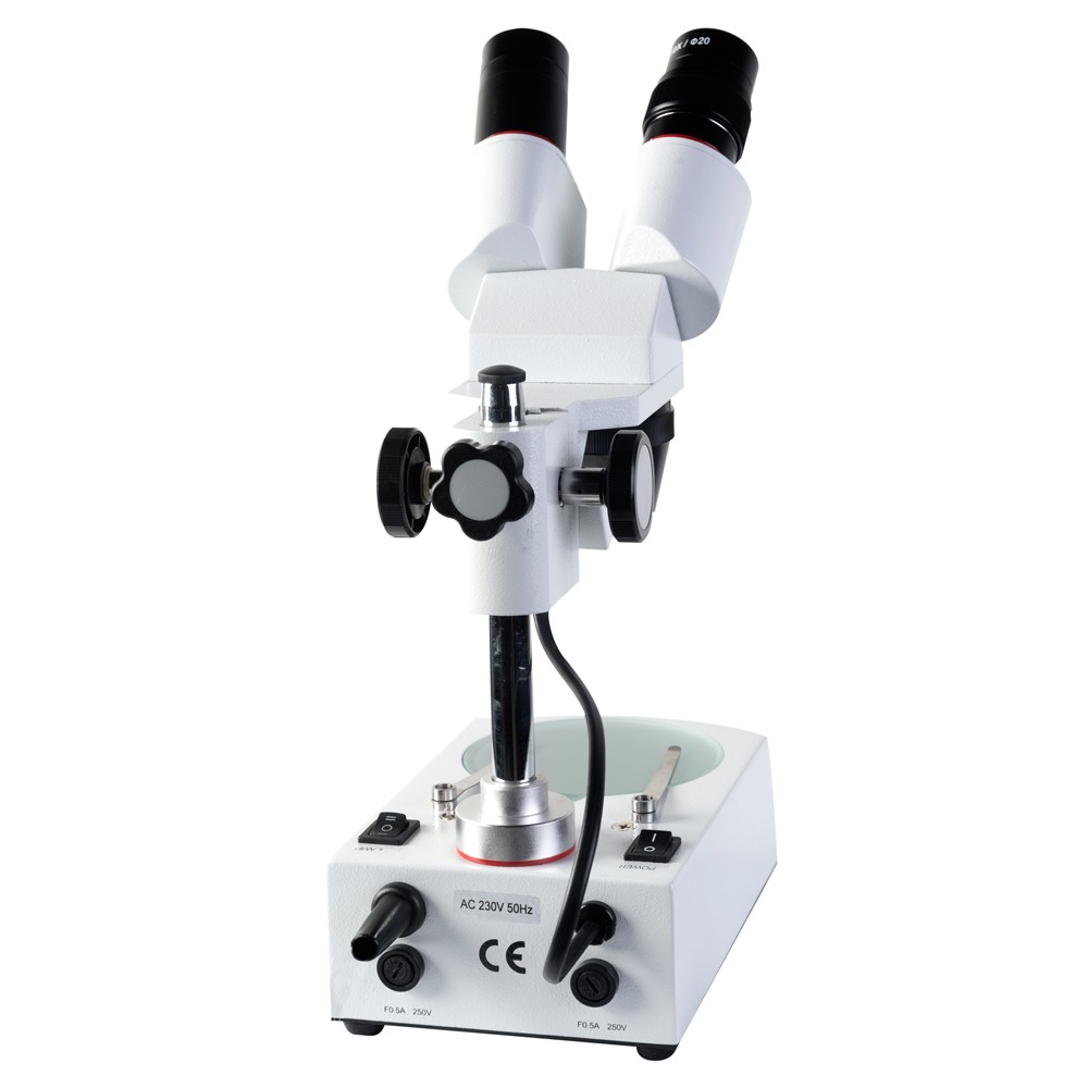 Имеет два увеличения 20х и 40х. Рабочее расстояние 57 мм, источники света – встроенные осветители отраженного и проходящего света.