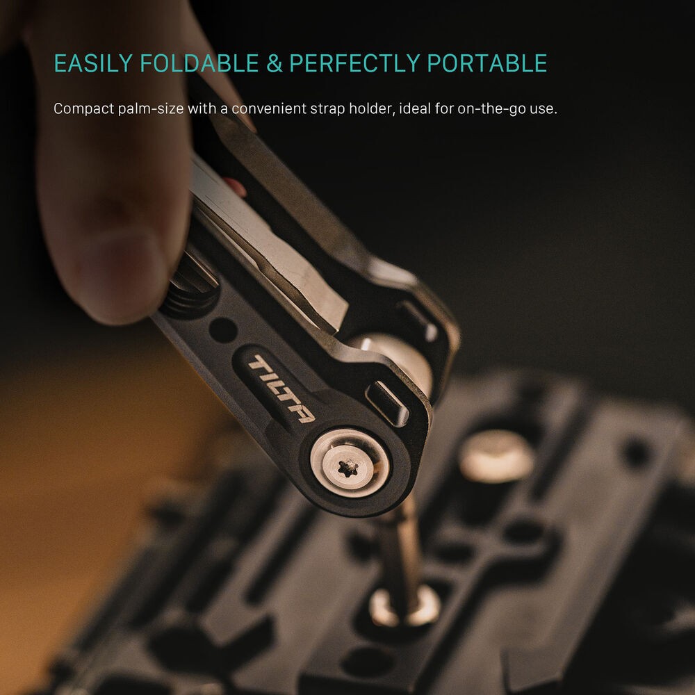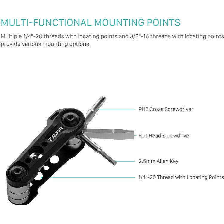 Этот многофункциональный мини-набор инструментов от Tilta включает в себя шесть универсальных инструментов, в том числе шестигранные ключи и насадки для отвёрток, которые пригодятся при сборке, разборке и повседневном использовании оборудования. Инструменты изготовлены из нержавеющей стали, что обеспечивает их долговечность и устойчивость к ржавчине. Многофункциональный мини-набор инструментов имеет корпус из алюминиевого сплава со стильным титаново-серым покрытием. Корпус оснащён одним креплением с резьбой 3/8"-16 и двумя креплениями с резьбой 1/4"-20 для дополнительной универсальности. Он достаточно мал, чтобы поместиться на ладони или в кармане, и имеет удобную петлю для крепления на ремне, чтобы его можно было носить с собой.