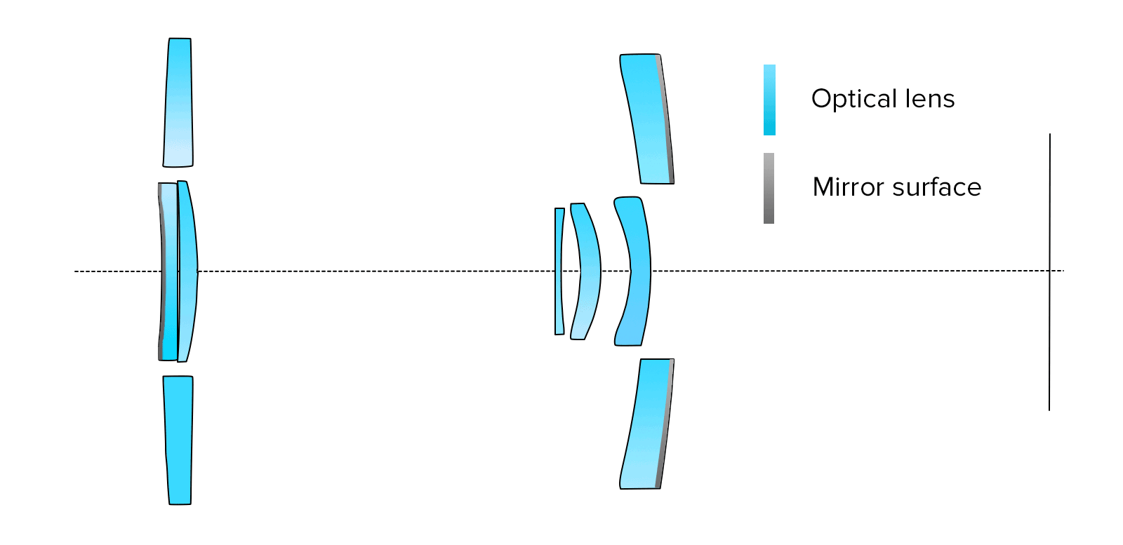 Внушительные 500 мм фокусного расстояния при такой компактности и лёгкости удалось реализовать благодаря катадиоптрической оптической конструкции. Зеркально-линзовые объективы включают в себя комбинацию из линз, имеющих зеркальное покрытие на внешней стороне стекла для отражения света назад и вперёд между концами линзы. Эта схема собирает свет, разрезая длину трубки пополам. Таким образом, конструкция делает физический размер объектива примерно в 3 раза короче обычного линзового. Объектив также имеет малый вес, поскольку зеркала намного легче оптического стекла.