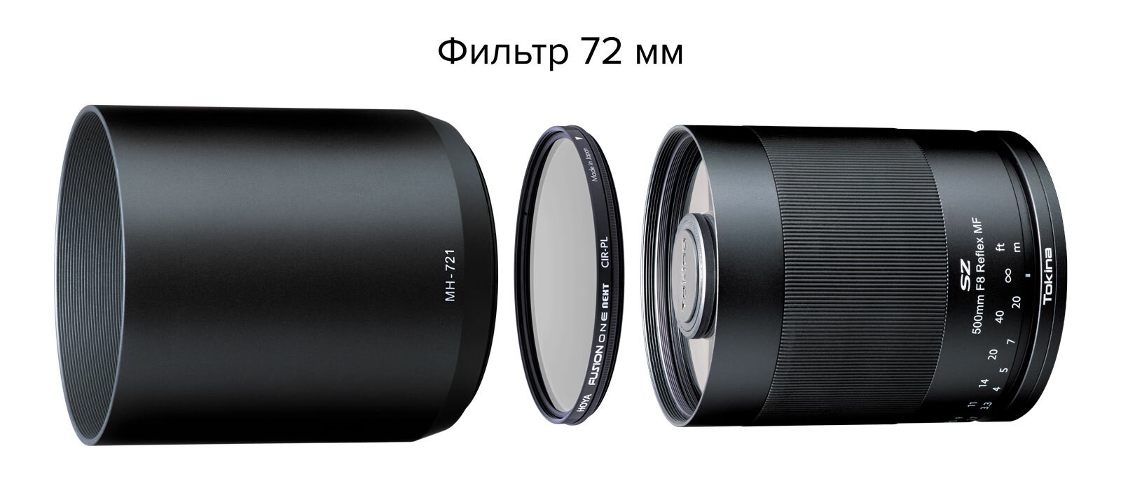 Tokina SZ SUPER TELE 500mm F8 Reflex MF позволяет использовать фильтры диаметром 72 мм (передняя резьба) и 30.5 мм (задняя резьба). Объектив поставляется с металлической блендой, которая накручивается на резьбу фильтра.