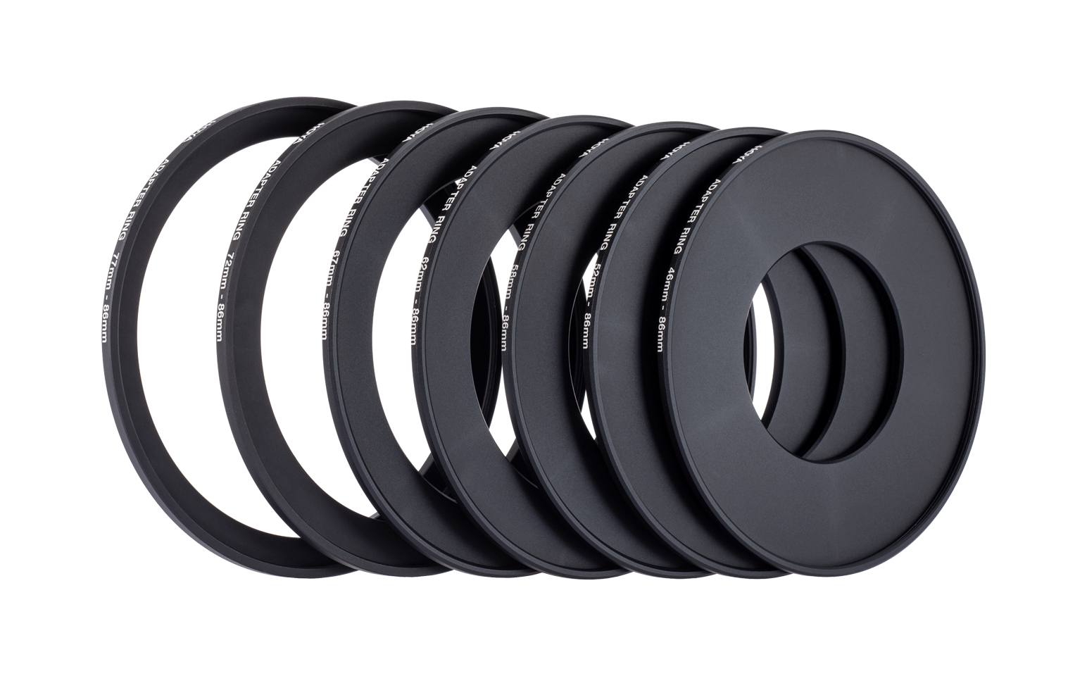В комплект держателя системы квадратных фильтров HOYA Sq100 входят два зубчатых адаптера, с помощью которых он крепится к объективу через резьбу для фильтров 86 мм или 82 мм. Для объективов с резьбой меньшего диаметра следует приобрести соответствующие переходные кольца.