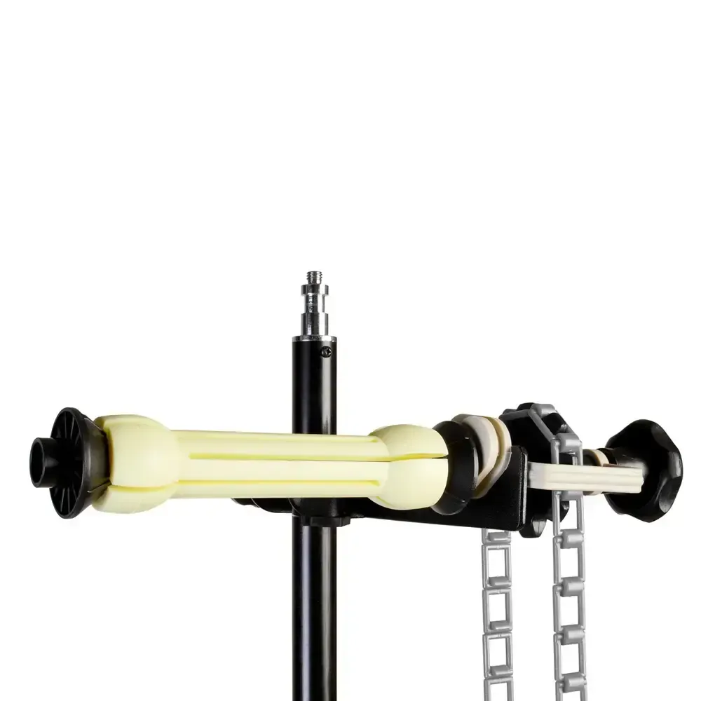 Подъемник состоит из двух держателей с цанговым механизмом, цепи и грузика-утяжелителя. Цанговый механизм (гантель) вставляется в трубку, на которую намотан фон. При повороте рукоятки держателя 4 лепестка цанги разжимаются и плотно фиксируются в трубке рулона.
