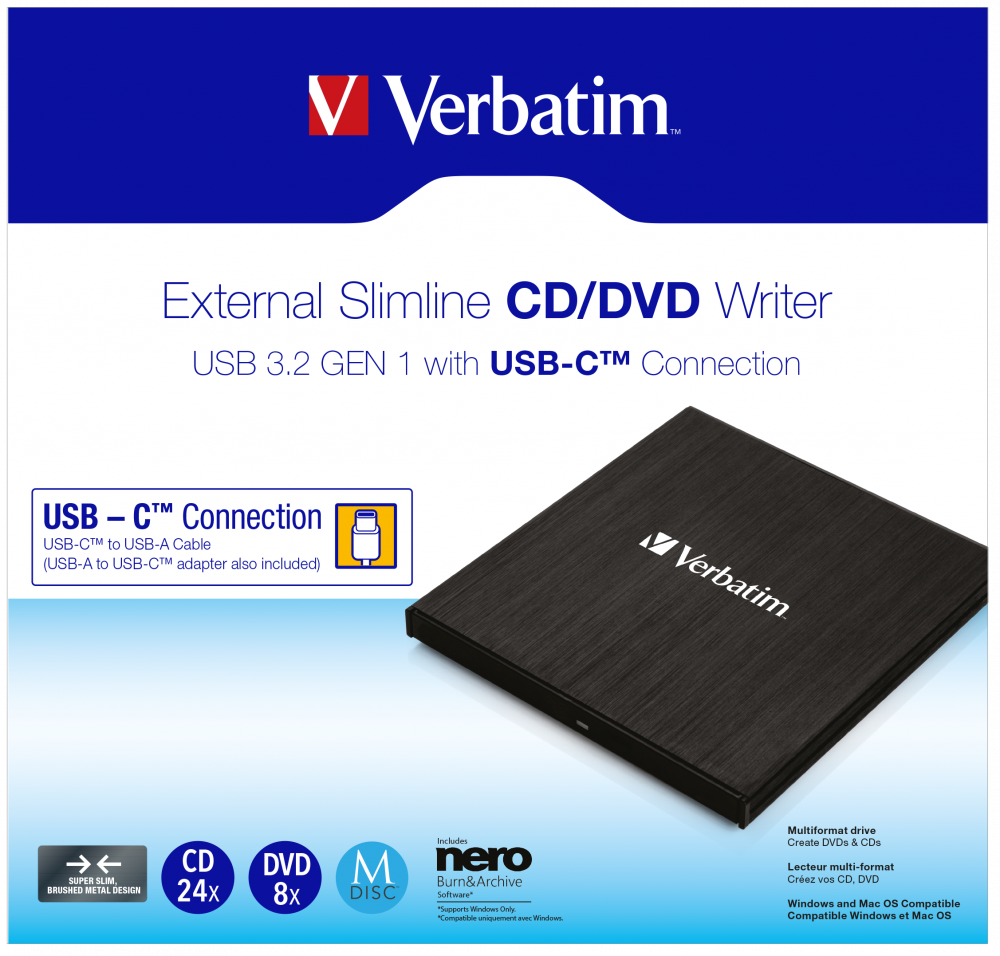 Все больше и больше производителей ноутбуков принимают решение исключить оптический привод из своих устройств для облегчения конструкции. Зачастую в таких ноутбуках порты USB-A заменяются компактными портами USB-C, которые обеспечивают более высокую скорость передачи данных. Тем не менее компакт-диски и DVD по-прежнему являются одними из самых широко распространенных типов носителей, особенно для архивирования важных данных! Компактный внешний пишущий привод CD/DVD Verbatim с разъемом USB-C позволит решить эту проблему и станет идеальным дополнением для вашего ноутбука, ультрабука и даже ПК. Используйте его для установки программного обеспечения или резервного копирования. Компактный внешний пишущий привод CD/DVD Verbatim по размерам лишь немного превосходит DVD и обеспечивается питанием через USB-порт, что позволяет отказаться от громоздких адаптеров!