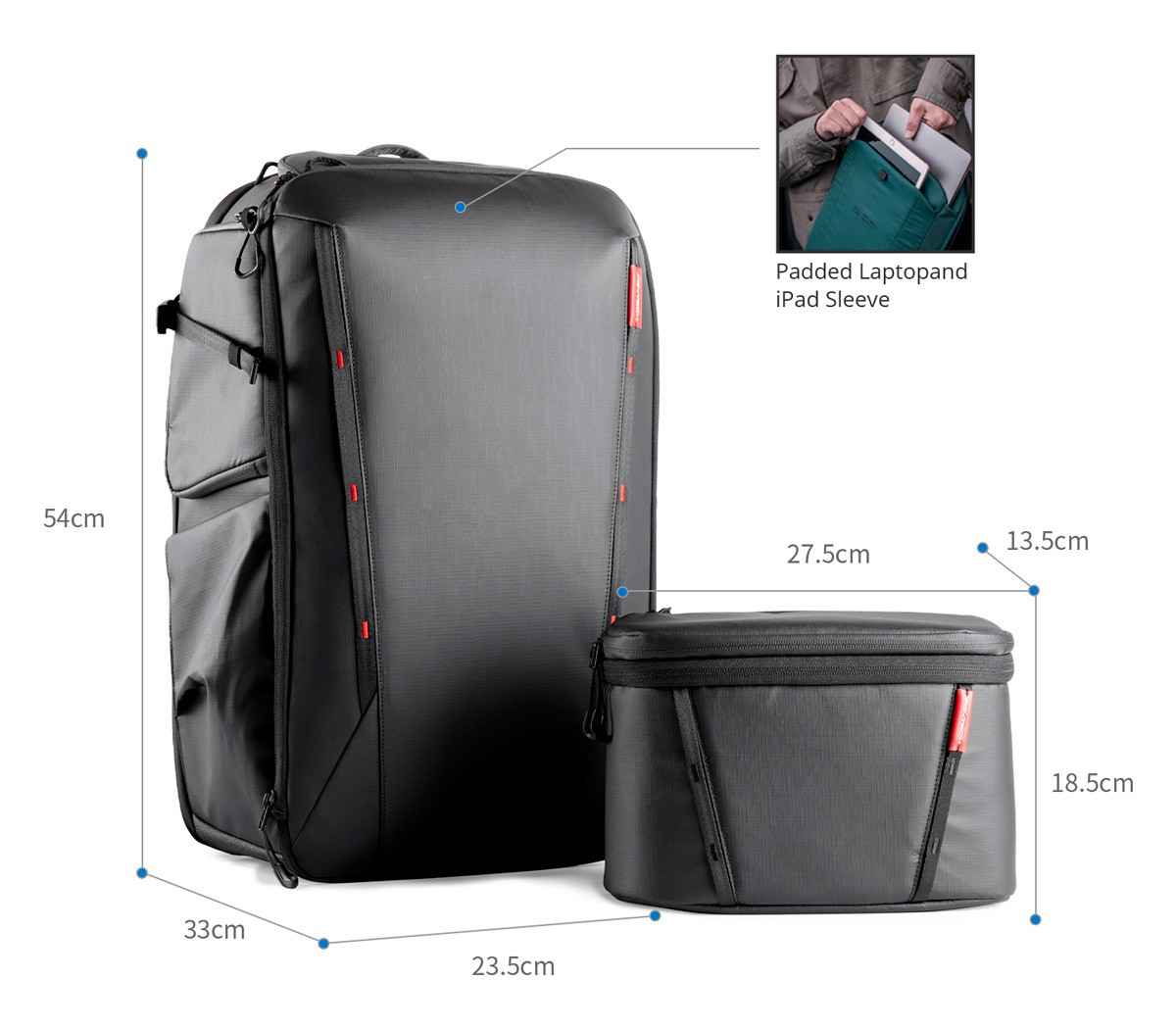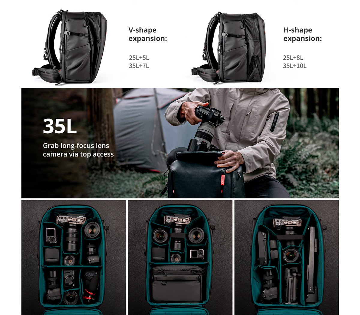 Многофункциональный рюкзак для профессиональных фотографов с большим набором оборудования. Включает в себя извлекаемую плечевую сумку, которую можно использовать отдельно (оставив рюкзак, например, в машине и в гостиничном номере). Передний карман расширяется на 10 литров, что позволяет положить в него личные вещи (одежду, средства гигиены) или же крупный электронный стабилизатор – такой как DJI Ronin или Zhiyun Crane. В комплект входит 14 разделителей различных размеров и форм, которые позволяют организовать внутреннее пространство под ваши индивидуальные требования. Также в комплекте идет внутренний ремень для фиксации длиннофокусных объективов и 2 внешних ремня для крепления таких аксессуаров как, например, штатив или туристический коврик (несколько точек крепления позволяют закрепить их как сбоку, так и снизу).