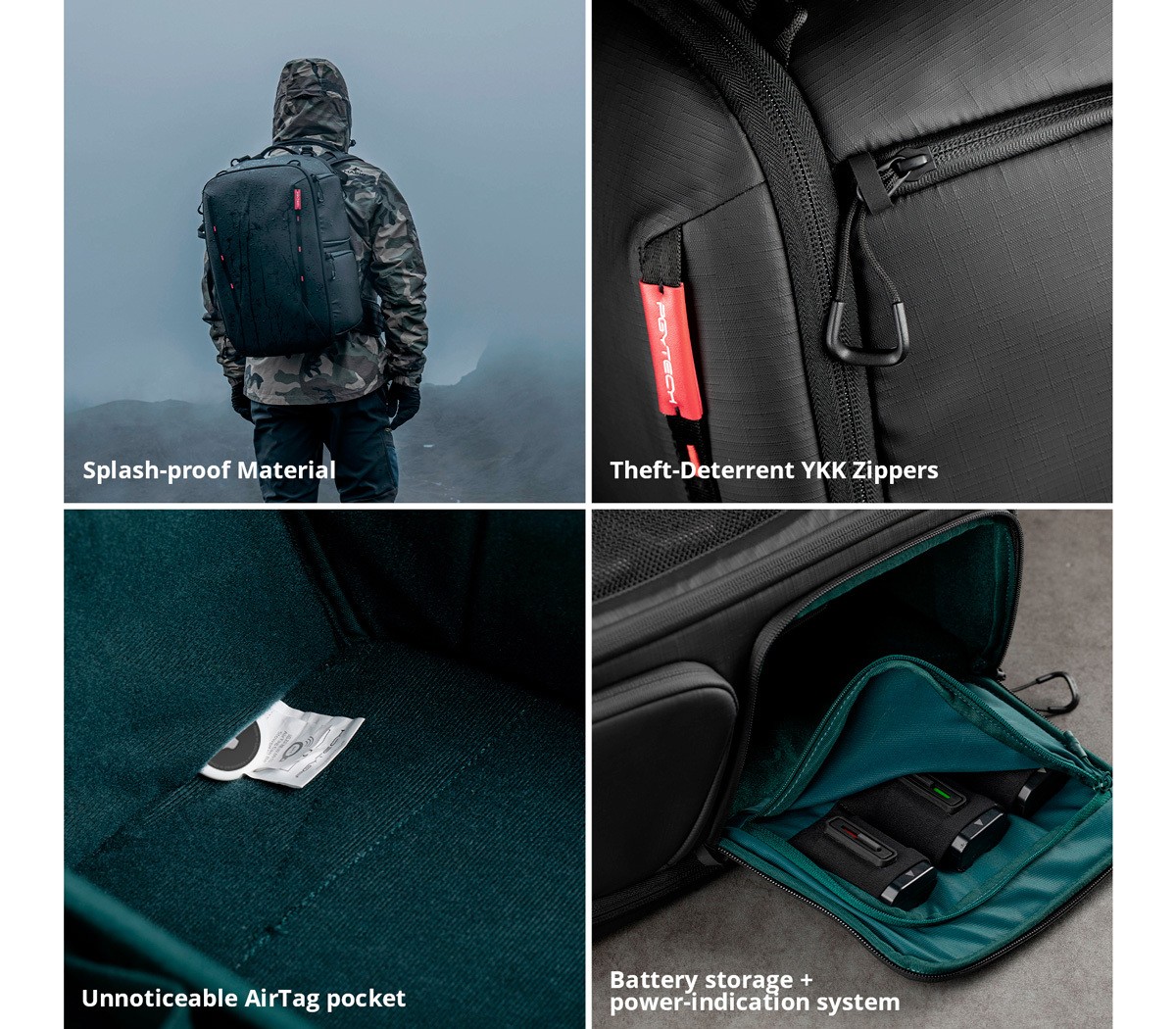 Рюкзак выполнен из плотного полиэстера с нецарапающимся и водостойким полиуретановым покрытием. Надежные и долговечные молнии бренда YKK также обладают защитой от брызг. Для длительного нахождения под дождем в комплекте идет нейлоновый чехол-дождевик. PGYTECH OneMo 2 35L проходит требования к ручной клади большинства авиакомпаний.