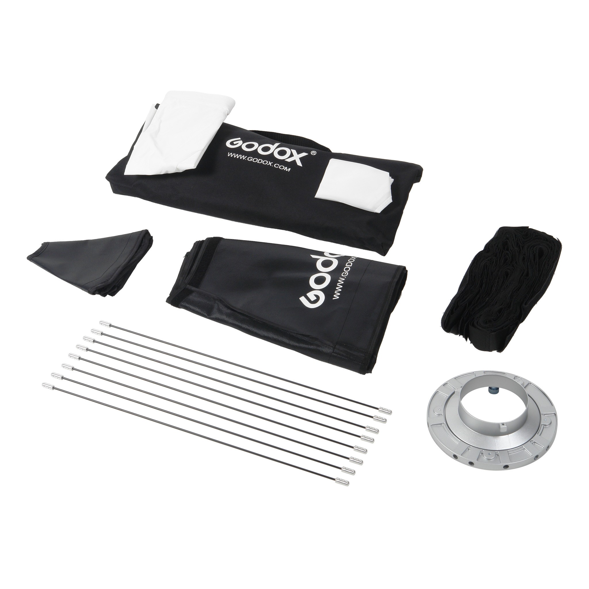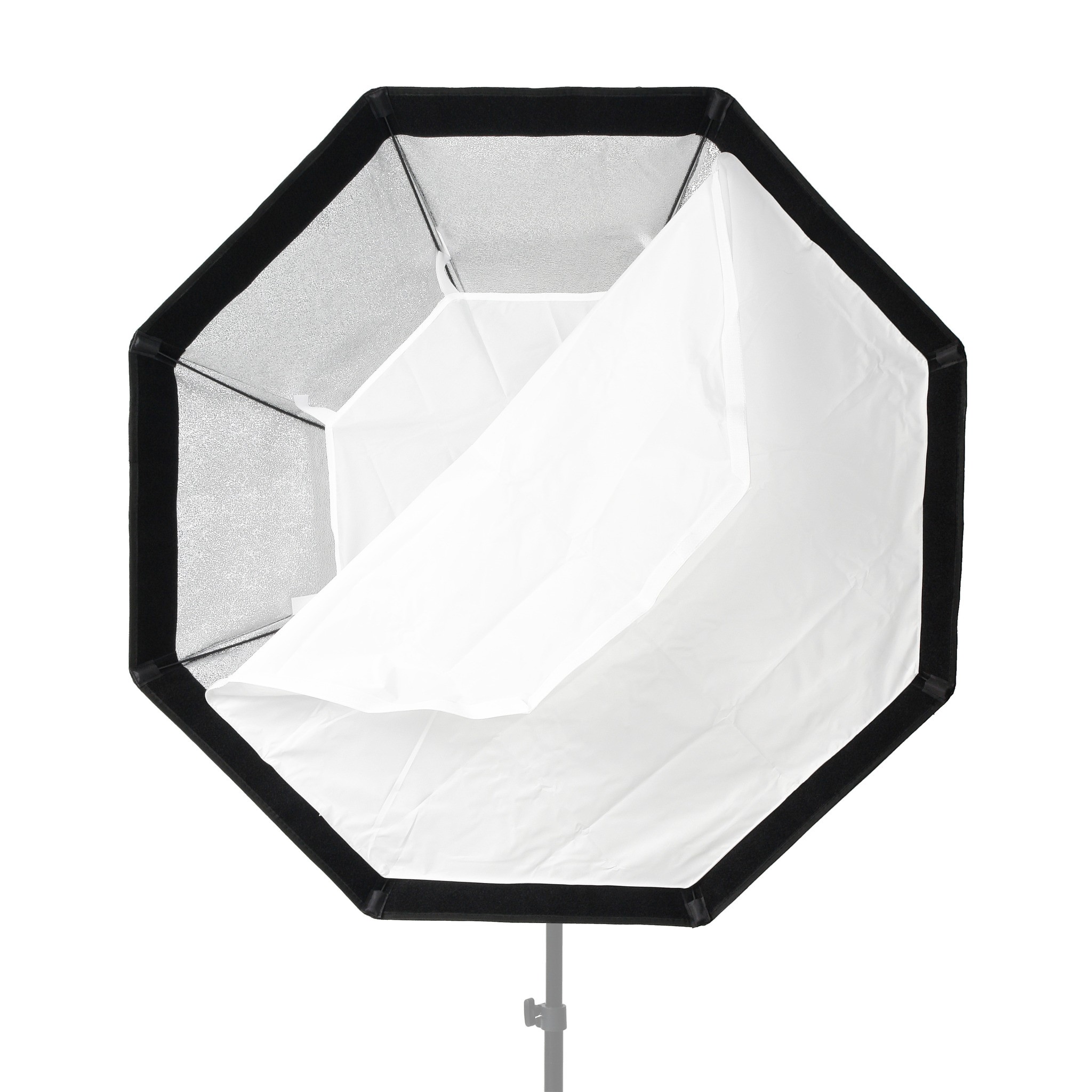 Закрытая конструкция позволяет избежать нежелательных бликов и потерь светового потока. Отражатель, с серебристой тканью внутри, обеспечивает равномерную засветку рассеивателя, который в свою очередь, благодаря большой поверхности, смягчает формируемые тени. Дополнительный внутренний диффузор улучшает равномерность светового потока. Наконечники на упругих металлических спицах не повреждают тканевые спицедержатели софтбокса и облегчают сборку конструкции.
