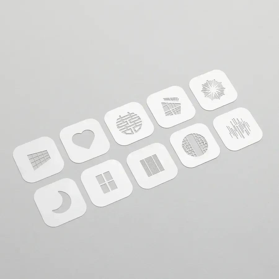 В комплект входят 10 креативных масок гобо: сердце, луна, двойное счастье, китайское окно, четыре окна, жалюзи,наклонное окно, геометрические фигуры, фейерверк и геометрия луча.