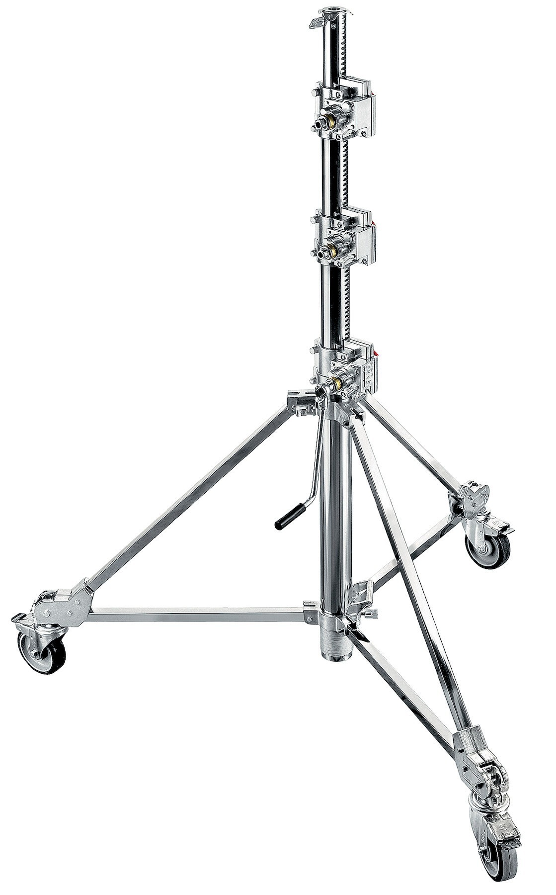 Стойка из хромированной стали. Конструкция из 4 секций с 3 фиксаторами, оснащена колесами с блокировкой. Эта сверхпрочная стойка выдерживает максимальную нагрузку до 70 кг и достигает максимальной высоты 4,27 м. Поставляется в комплекте с механизмом подъема (Wind Brace Kit).