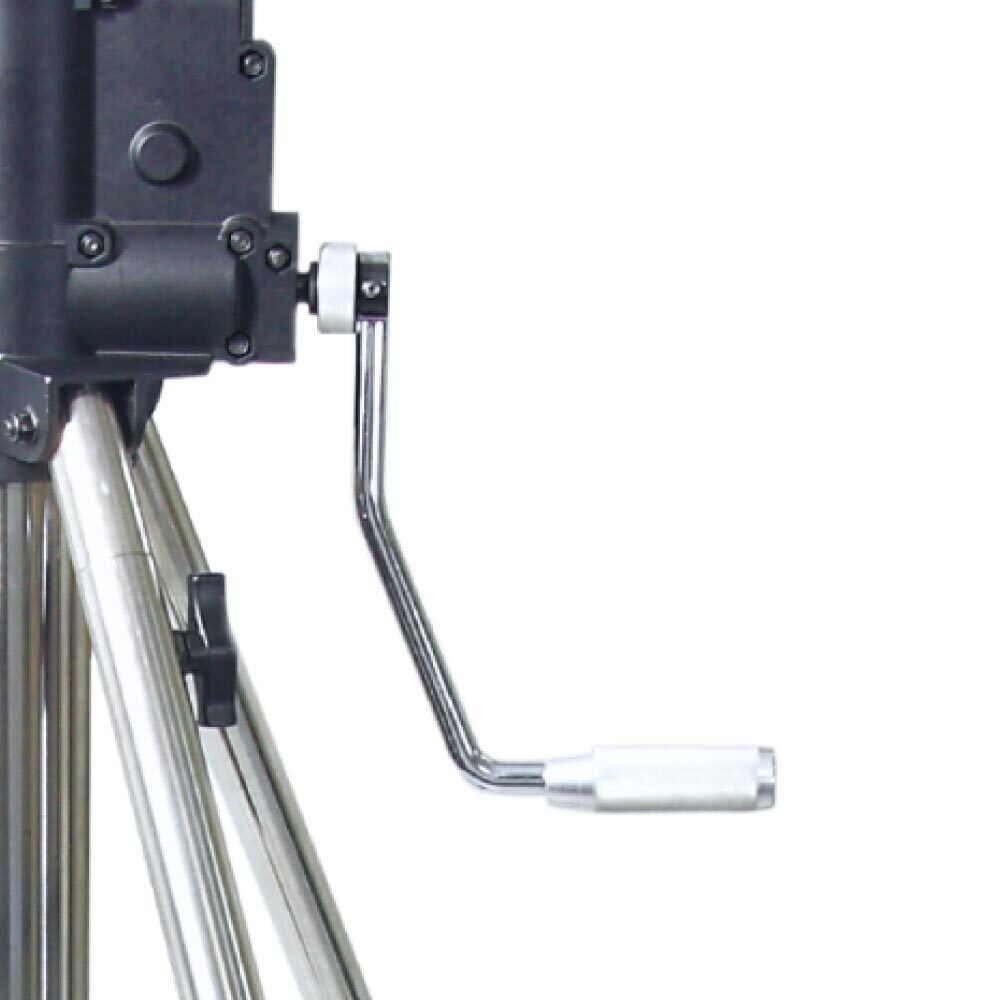 Стойка с редукторной колонной KUPO 484 HEAVY DUTY WIND-UP STAINLESS STEEL STAND - сверхмощная стойка с креплением для защиты от ветра, колёсами с тормозами и редукторной рукояткой для легкого подъема тяжелого оборудования весом до 80 кг. Благодаря двум одновременно выдвигающимся секциям, рабочая высота стойки составляет от 179 см до 386 см. Автоматический самоблокирующийся механизм и система безопасного подъема с кривошипной рукояткой обеспечивают безопасность и точность в работе. Сверху на стойке расположено 28мм гнездо с 3 отверстиями для установки комплекта защиты от ветра. Центральная колонна, ноги и U-образные распорки изготовлены из нержавеющей стали, а две верхние секции - из хромированной стали для дополнительной прочности. Две верхние секции выдвигаются одновременно на 4.4см при каждом полном повороте рукоятки. Выравнивающая выдвижная ножка позволяет компенсировать наклон или неровности пола. 6-дюймовые колёса оборудованы тормозными колодками с широкой педалью и отвечают промышленным требованиям.