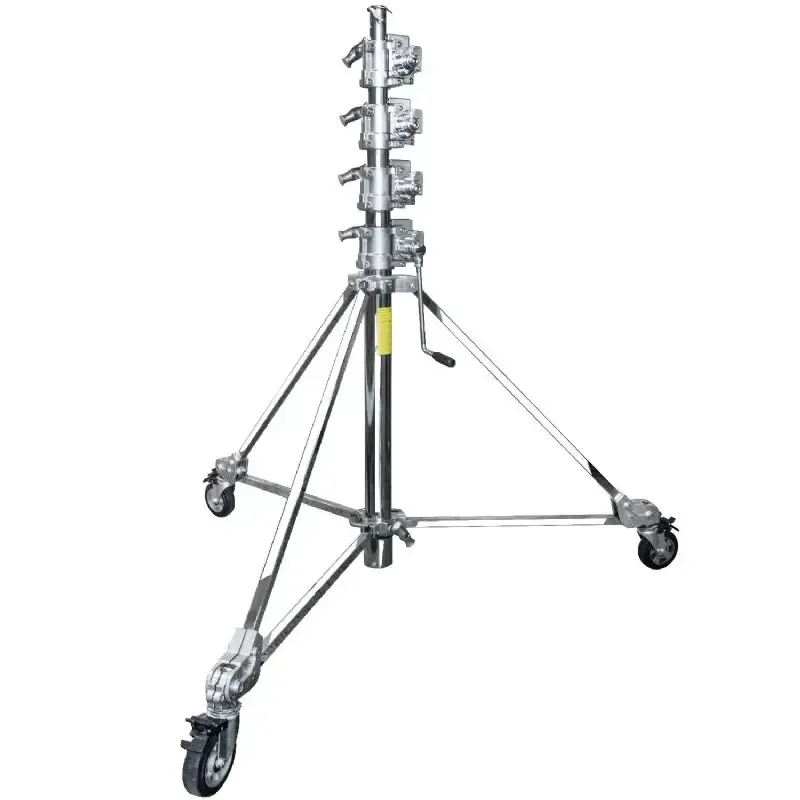 Стойка с редукторной колонной KUPO 756M JUMBO CRANKING STAND - это прочное и надежное решение для безопасной установки очень тяжелого оборудования. Изготовленная из хромированной стали, эта стойка создана с учетом всех требований безопасности, чтобы соответствовать стандартам отрасли. Грузоподъемность до 70 кг и максимальная рабочая высота 6,1 м делают эту стойку способной выдерживать даже очень тяжелое оборудование. Стойка Kupo 756M оснащена редукторным механизмом с прямым приводом и системой автоматической блокировки, что обеспечивает более высокую производительность по сравнению с традиционными шкивами и тросами. Каждая секция имеет Т-образную рукоятку увеличенного размера для максимального крутящего момента при фиксации, а сдвоенная рукоять на крестовине позволяет удобно складывать/раскладывать основание. Гнездо Junior 1-1/8" (28 мм) на верхней части стойки оснащено проушинами для крепления тросов, что обеспечивает устойчивость даже в сложных погодных условиях. Встроенные колеса с тормозами обеспечивают комфортную и легкую перестановку, сохраняя безопасность во время съемок. Уникальная конструкция удерживает колеса для комфортного перемещения стойки, когда её основание сложено.