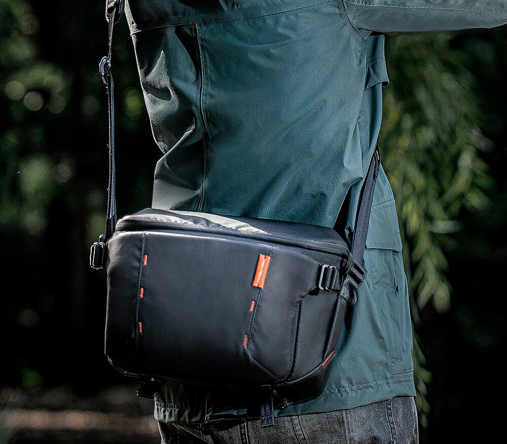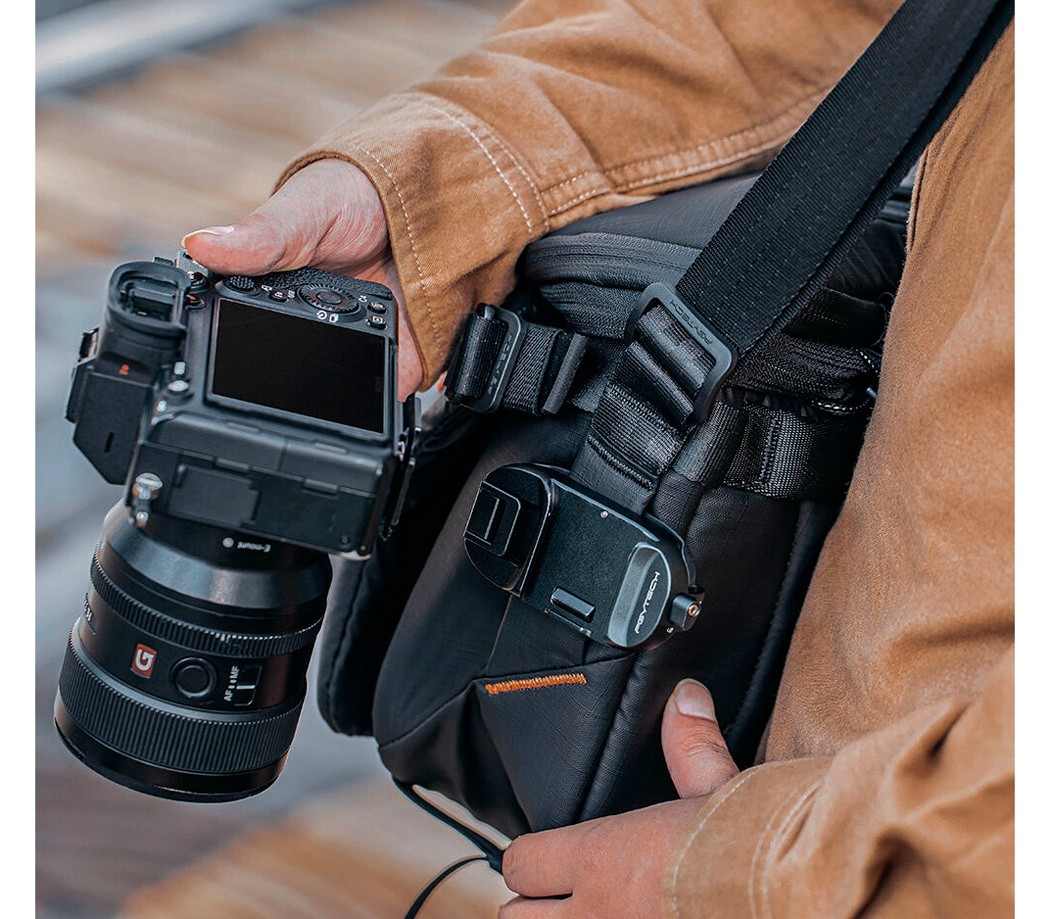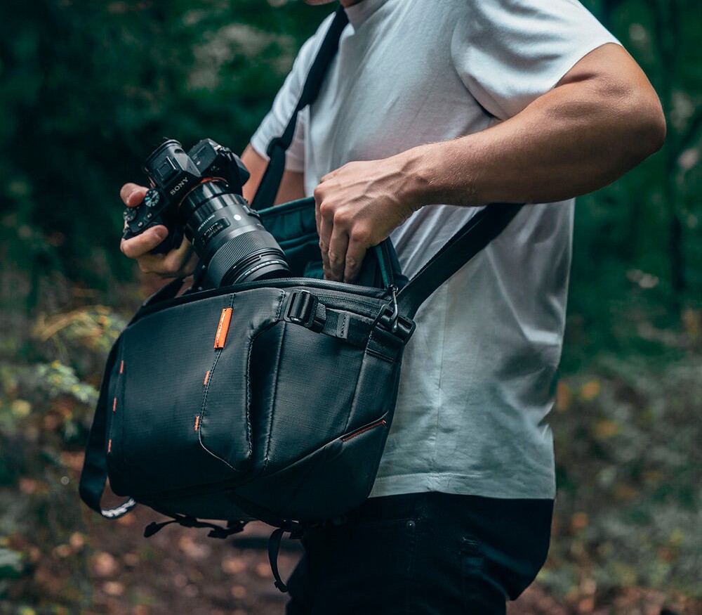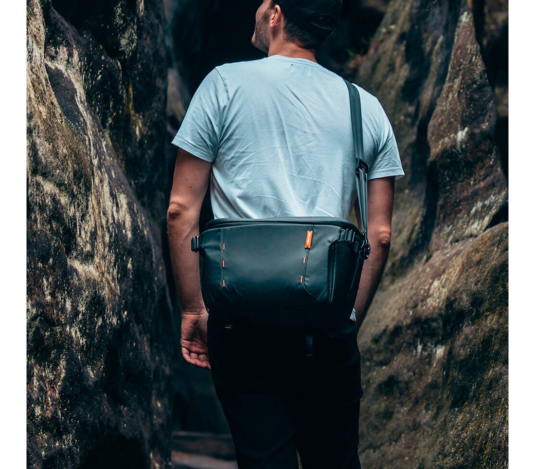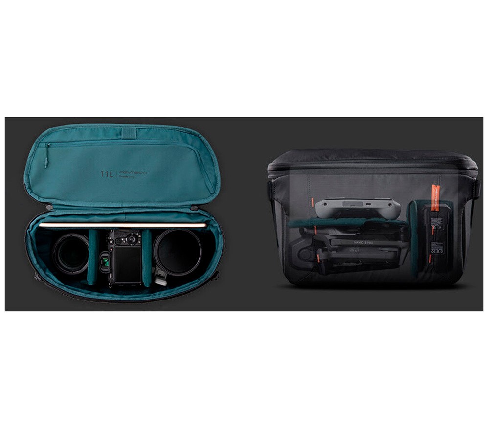 PGYTECH OneMo Sling – это серия плечевых сумок с необычным дизайном. Передний карман выполнен в виде слинга для новорожденных: его можно отодвинуть от тела самой сумки, чтобы положить в образовавшееся пространство стабилизатор или легкую куртку. Основное отделение можно увеличить в высоту на 4 см, чтобы в него вертикально поместился телеобъектив, такой как 70-200/2.8 (установленный на камеру). Модель 11L рассчитана на одну камеру с 3-4 объективами (или с парой объективов и вспышкой), она также подходит для переноски складных квадрокоптеров (DJI Mavic и их аналоги) вместе с пультом управления и другими аксессуарами. Внутри сумки имеется отдельный защищенный карман для компактного ноутбука (до 14"). Передний карман (слинг) не обладает защитой от ударов, поэтому в него лучше складывать небьющиеся вещи: ключи, карточки, документы и так далее.