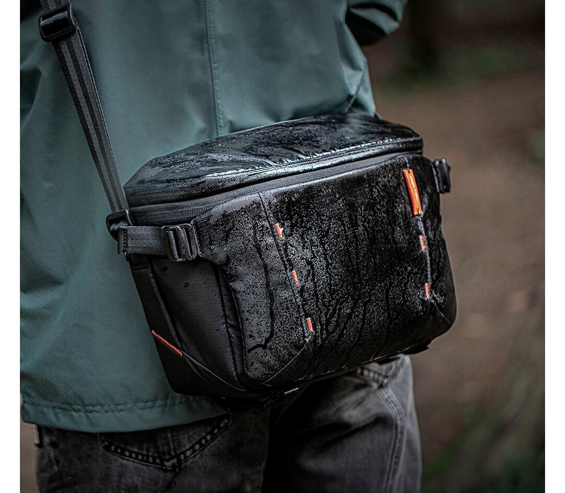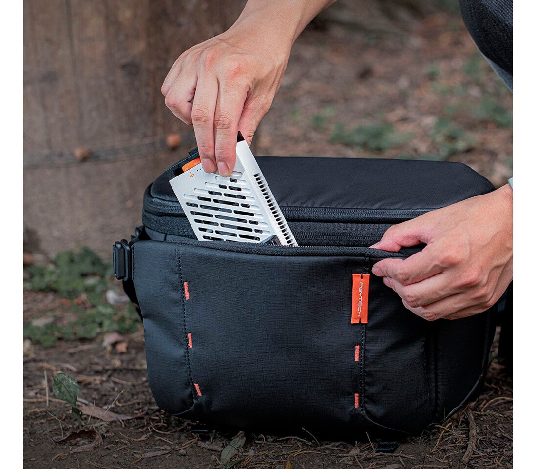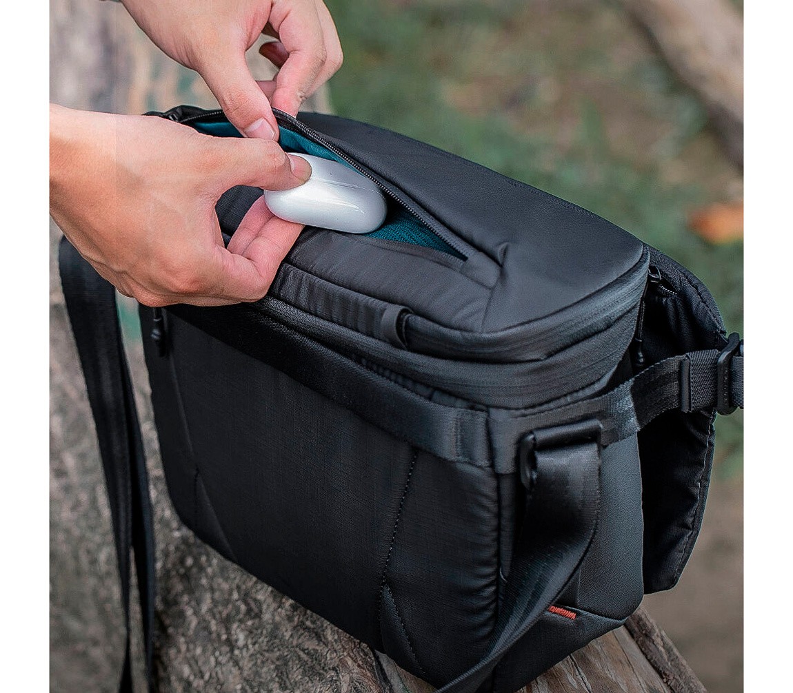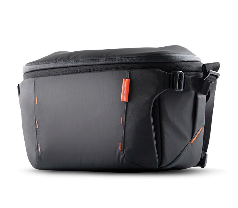 PGYTECH OneMo Sling – это серия плечевых сумок с необычным дизайном. Передний карман выполнен в виде слинга для новорожденных: его можно отодвинуть от тела самой сумки, чтобы положить в образовавшееся пространство стабилизатор или легкую куртку. Основное отделение можно увеличить в высоту на 4 см, чтобы в него вертикально поместился телеобъектив, такой как 70-200/2.8 (установленный на камеру). Модель 11L рассчитана на одну камеру с 3-4 объективами (или с парой объективов и вспышкой), она также подходит для переноски складных квадрокоптеров (DJI Mavic и их аналоги) вместе с пультом управления и другими аксессуарами. Внутри сумки имеется отдельный защищенный карман для компактного ноутбука (до 14"). Передний карман (слинг) не обладает защитой от ударов, поэтому в него лучше складывать небьющиеся вещи: ключи, карточки, документы и так далее.
