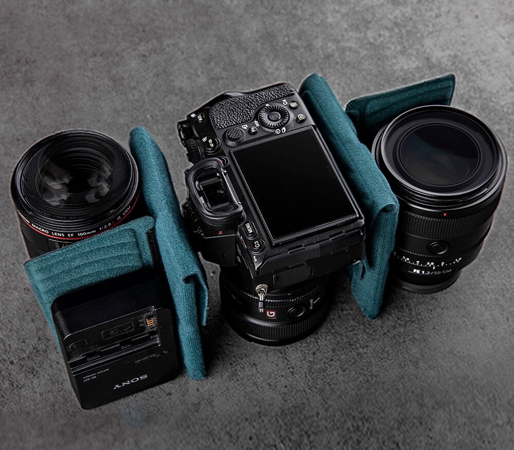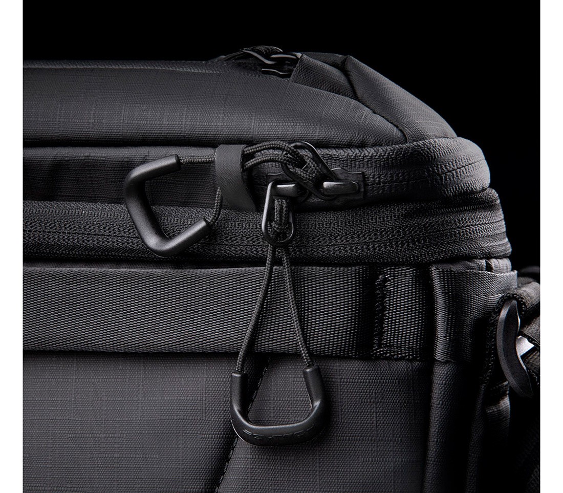Верхний клапан сумки широко раскрывается для свободного доступа ко всему содержимому. Внутри на нем располагается карман с органайзером для аккумуляторов: каждый карманчик оснащен индивидуальным ползунком-индикатором: зеленый означает свежие батареи, красный – разряженные. Вы просто сдвигаете ползунок в соответствующую сторону, чтобы впоследствии не вспоминать, какие из аккумуляторов надо поставить на зарядку. Снаружи на верхнем клапане также имеется небольшой карман для таких мелочей как светофильтры или наушники типа AirPods. Ручка у сумки располагается не сверху, а сзади, что создает более изящный внешний вид, а также позволяет с легкостью фиксировать сумку на ручке от дорожного чемодана. Снизу предусмотрены два ремешка, на которые можно закрепить компактный штатив или свернутую куртку. Сбоку снаружи можно закрепить пряжку для камеры типа PGYTECH Beetle или Peak Design Capture. Внутри у сумки также имеется потайной кармашек для трекера AirTag, который позволит быстро найти сумку в случае утери.
