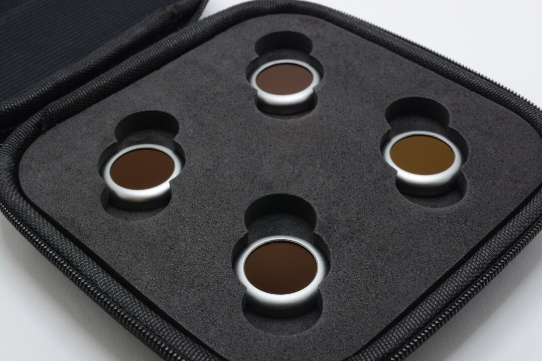 На фильтры наносится антибликовое покрытие вместе с гидрофобным слоем, благодаря которому фильтры легко чистить и обслуживать. Фильтры крепятся на камере квадрокоптера при помощи резьбовой оправы и поставляются в жестком чехле, который надежно защитит их.