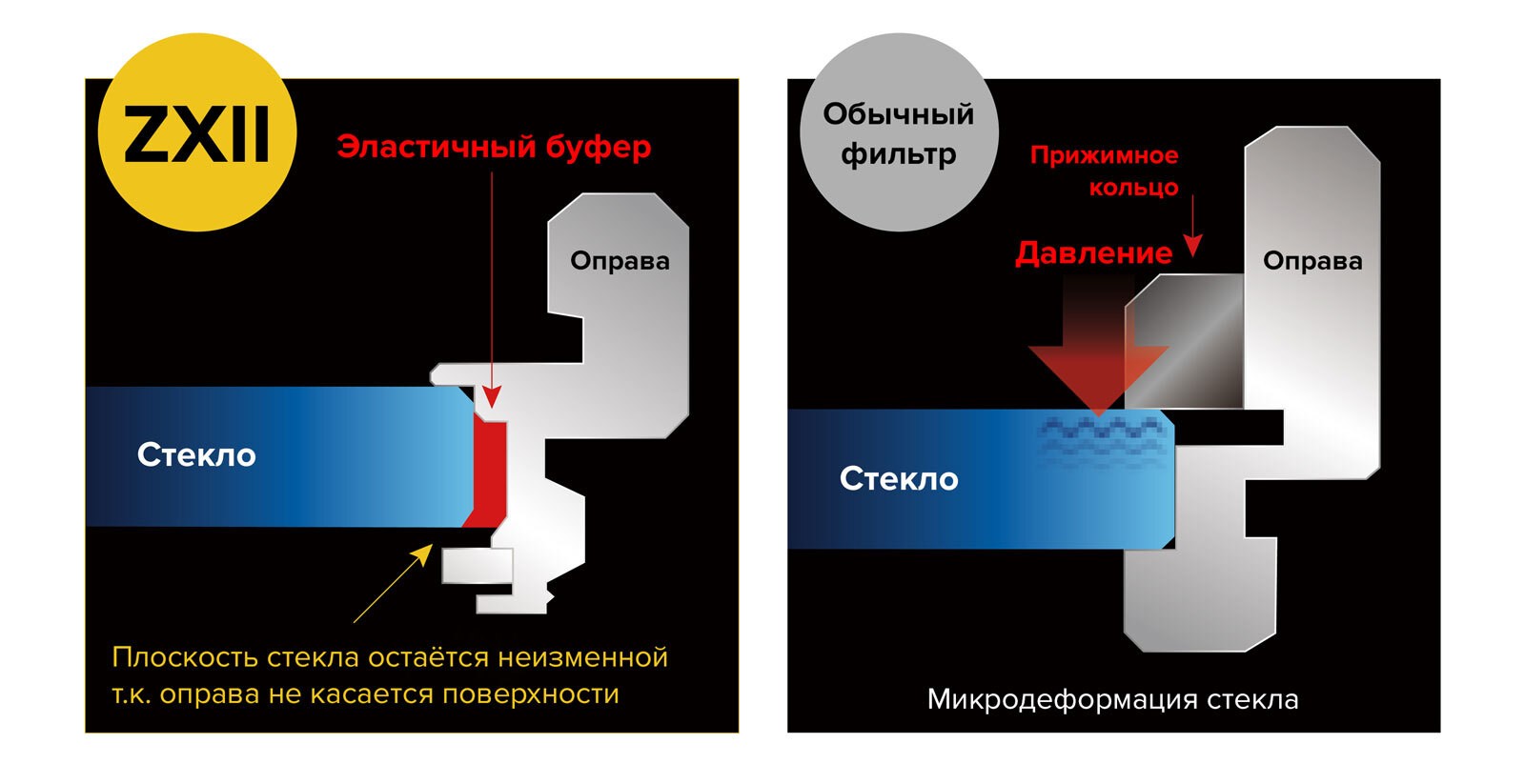 Технология "Floating Frame" применена в новых фильтрах серии ZXII. Специальный эластичный амортизирующий слой между стеклом и оправой обеспечивает надёжную фиксацию, снижая при этом до минимального уровня давление на стекло. Стеклянный элемент остается плоским, не деформируется и не прокручивается внутри рамы. Вместе с использованием других технологий удалось достичь сенсационных результатов в разрешающей способности новых фильтров, что даёт фотографу большие преимущества, особенно при съёмке в 4K или 8K.