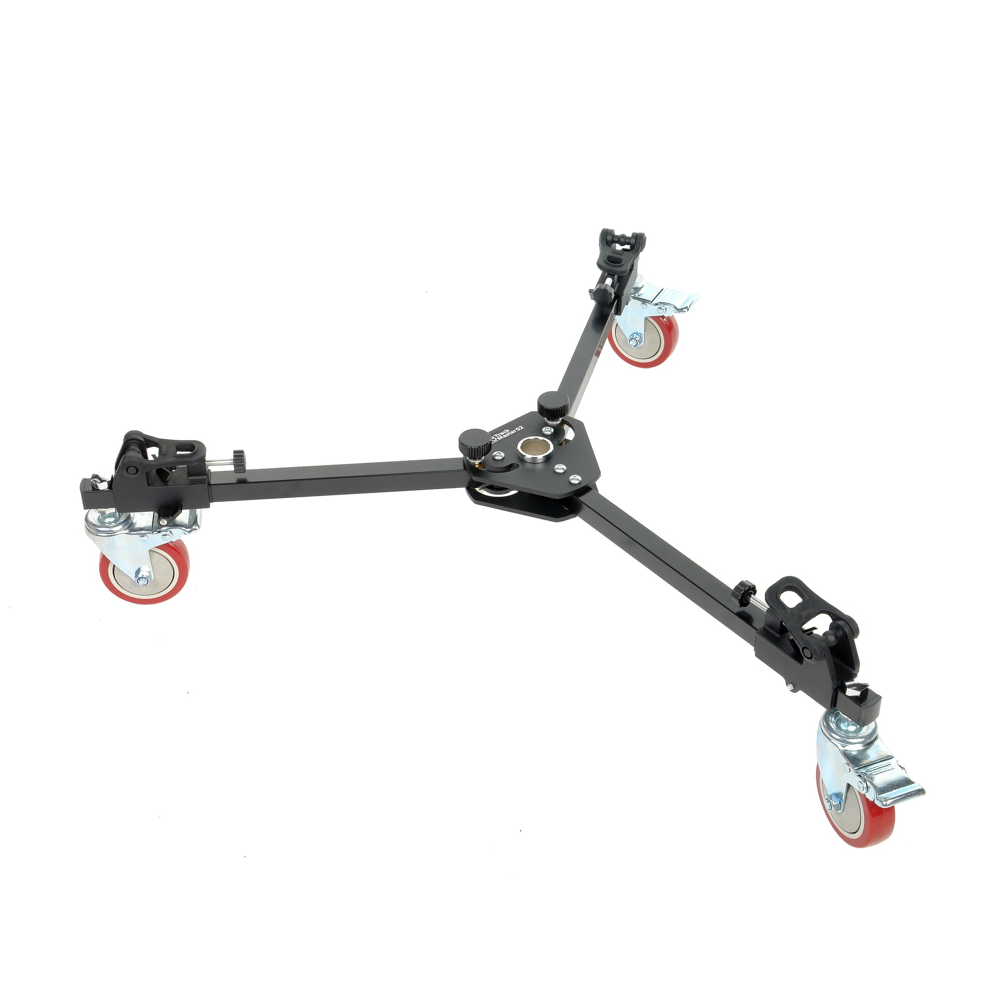 Тележка универсальная, с регулируемым положением упоров под размах ног треноги или стойки, подходит для крепления обычных (с резиновыми наконечниками) или шипованных (с двумя шипами) опор видеоштатива. Используется при различных видах видеосъемки – для плавных проводок в кадре по прямой траектории или дуге с разными радиусами, и в том числе для поворота камеры вокруг своей оси или съемки «одним кадром»