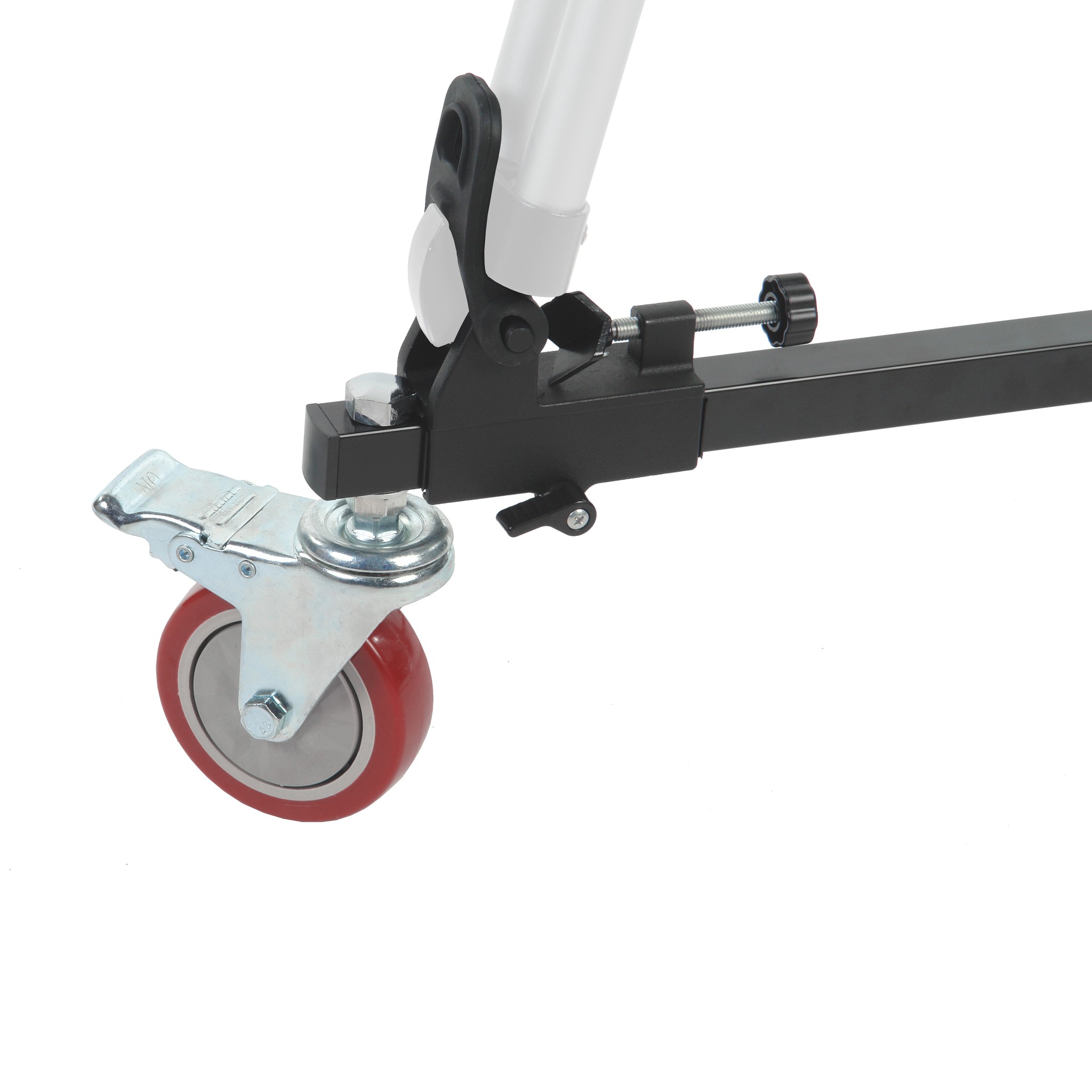Складная трехколесная тележка для тяжелых штативов и стоек (нагрузка до 80 кг) с регулируемым положением упоров. Подходит для обычных и шипованных ножек опоры. Колеса _100 мм, тормоз на 3-х колесах. Профиль платформы – квадратная металлическая труба 25х25 мм, вес 4.3 кг.